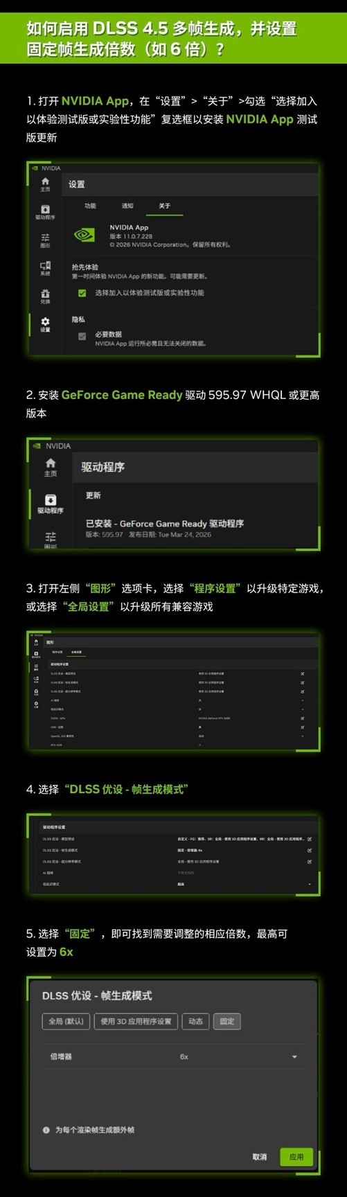 换言之,它会根据你设定的帧率或匹配显示器刷新率,仅生成必要的帧,无论你的显示器是120Hz、144Hz、240Hz或更高。如何开启DLSS4.5动态多帧生成呢?一图看懂~