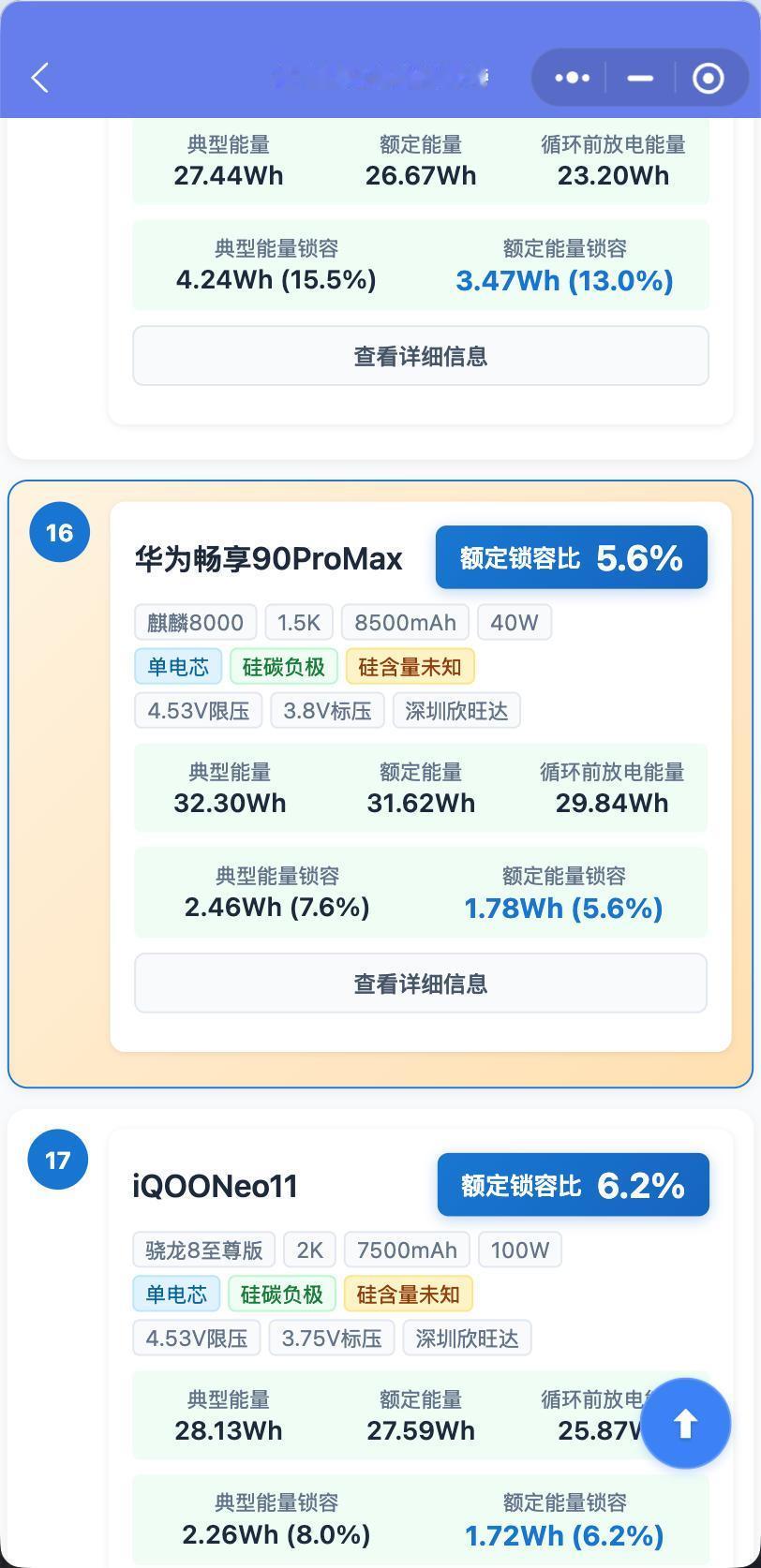 华为畅享90ProMax 搭载华为有史以来最大的8500mAh电池,拆机实测电池能量密度为884Wh/L,在我们电池能量密度排行榜排名第13。