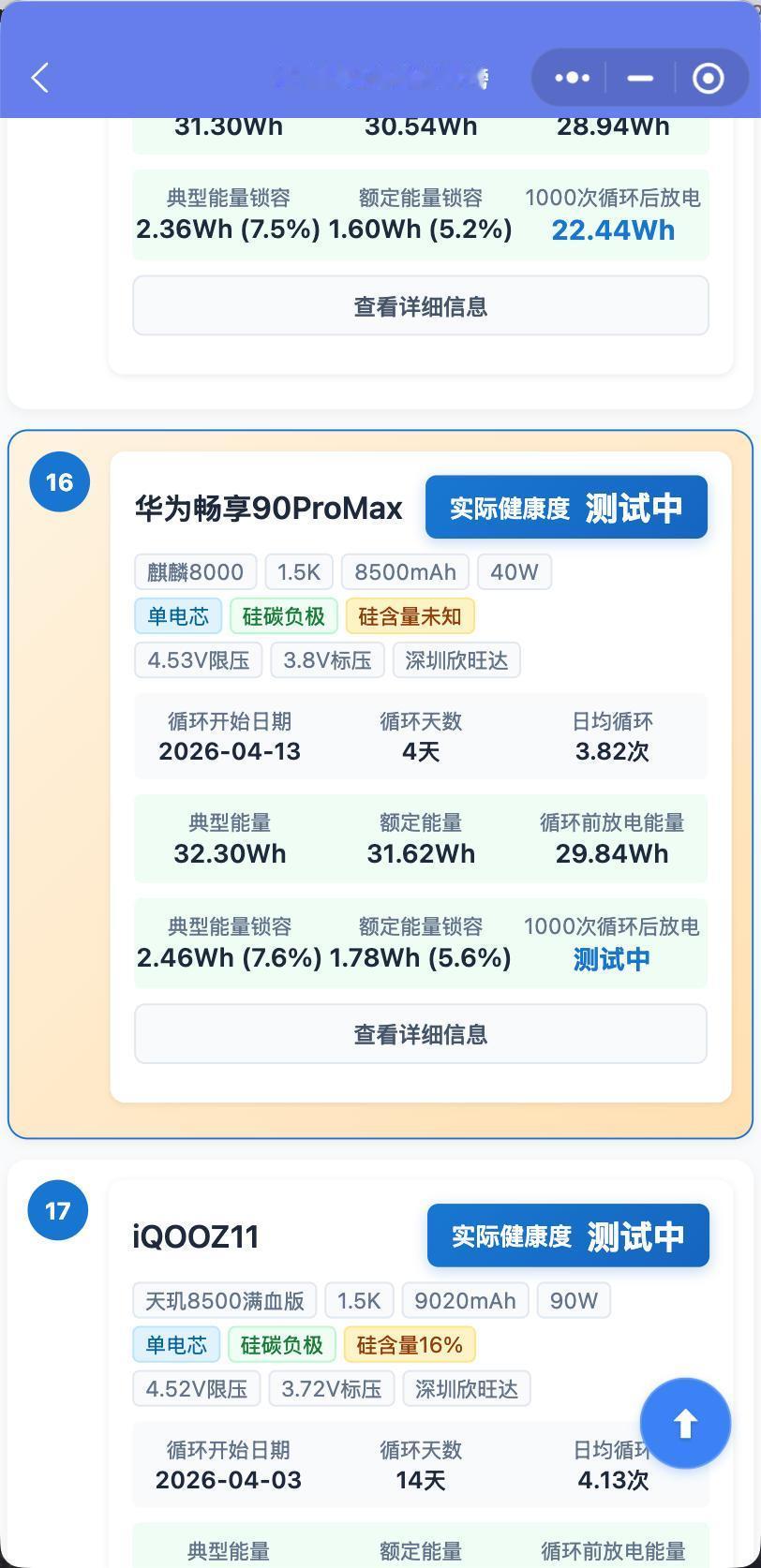 已于2026年4月13日加入电池循环系统中,每轮循环充电约2小时,耗电约4个半小时,一轮循环需要约6个半小时,平均日循环3-4次。