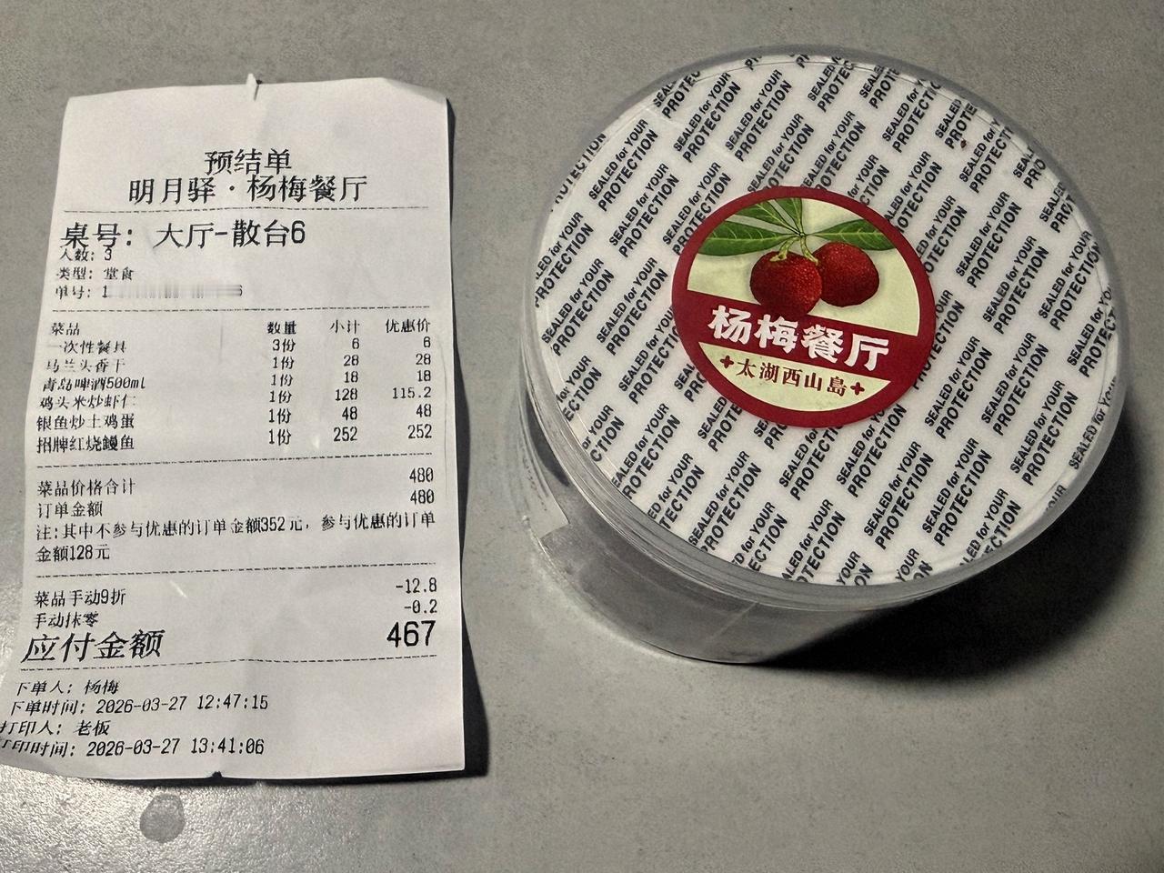 提了一点小建议,老板客气,一个菜打了折,又送了一盒他们自制的杨梅,非常好吃!
