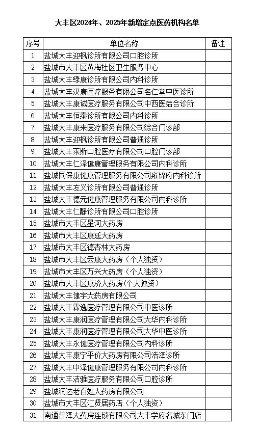 2026年4月15日,盐城市医疗保险基金管理中心大丰分中心依据相关管理办法,公布了大丰区2024年、2025年新增医保定点医药机构名单,涵盖盐城大丰迎枫诊所有限公司口腔诊所、盐城市大丰区星河大药房等31家医疗机构与零售药店,方便参保人员就近就医购药。