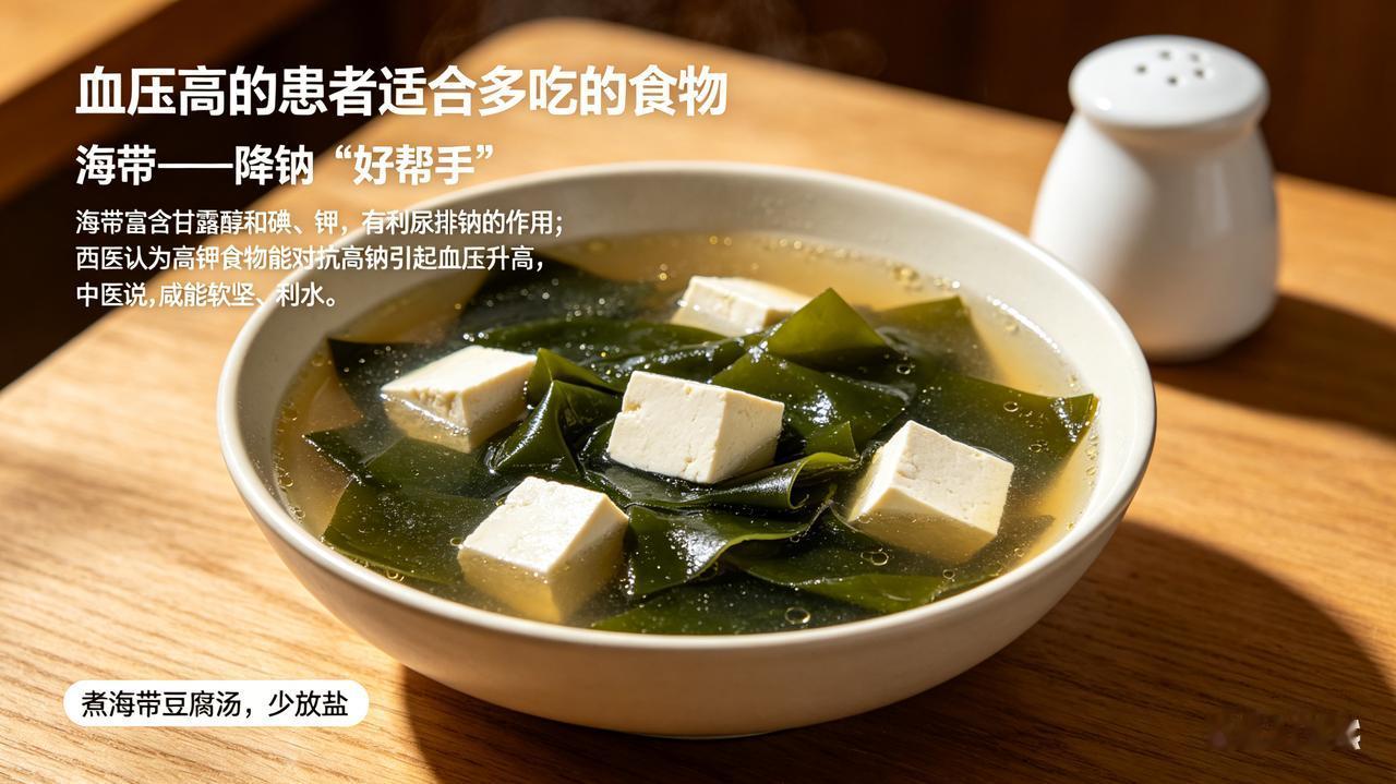 海带富含甘露醇和碘、钾,有利尿排钠的作用。西医认为高钾食物能对抗高钠引起的血压升高;中医说“咸能软坚、利水”。建议:煮海带豆腐汤,少放盐。