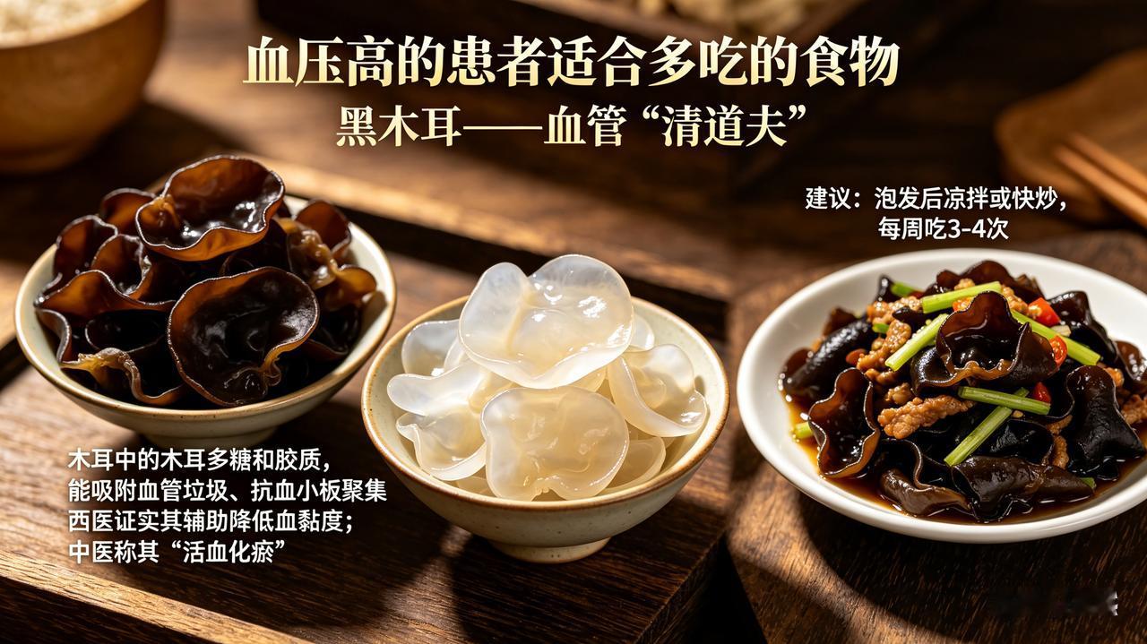 木耳中的木耳多糖和胶质,能吸附血管垃圾、抗血小板聚集。西医证实其辅助降低血黏度;中医称其“活血化瘀”。建议:泡发后凉拌或快炒,每周吃3-4次。