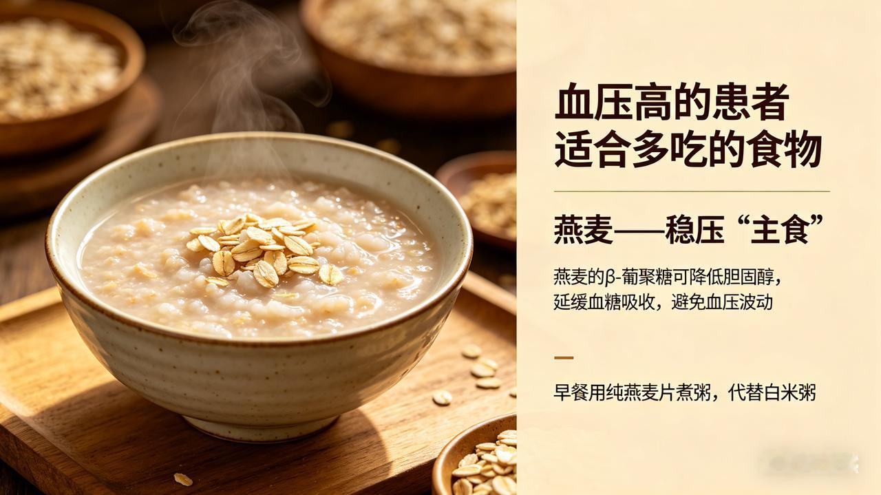 燕麦的β-葡聚糖可降低胆固醇,延缓血糖吸收,避免血压波动。建议:早餐用纯燕麦片煮粥,代替白米粥。