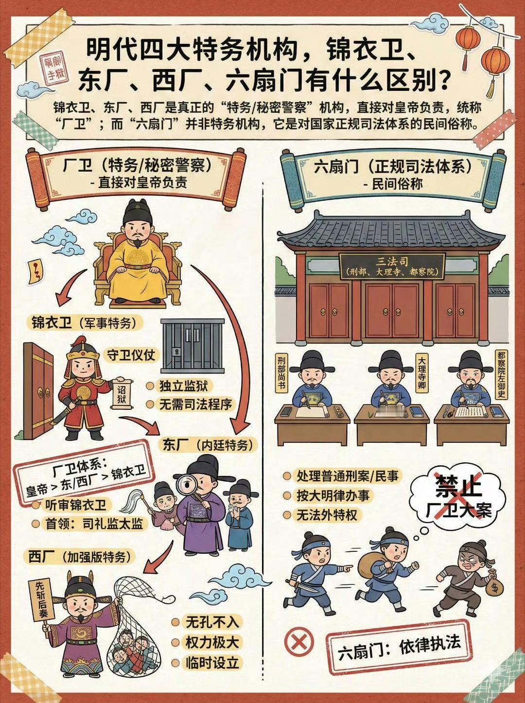 锦衣卫、东厂、西厂、六扇门有什么区别?