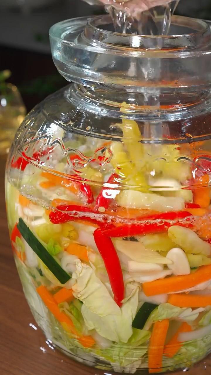 更实用的是,泡完菜的母水千万别倒,留着泡芥菜、辣椒、酸豆角,后续拿来爆炒肥肠、做酸菜鱼,那味道又香又爽口,比外面买的泡菜汁好用太多。