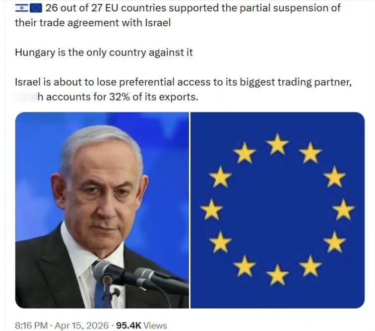 欧盟27个成员国中,有26个支持部分暂停与以色列的贸易协议,匈牙利是唯一投反对票
