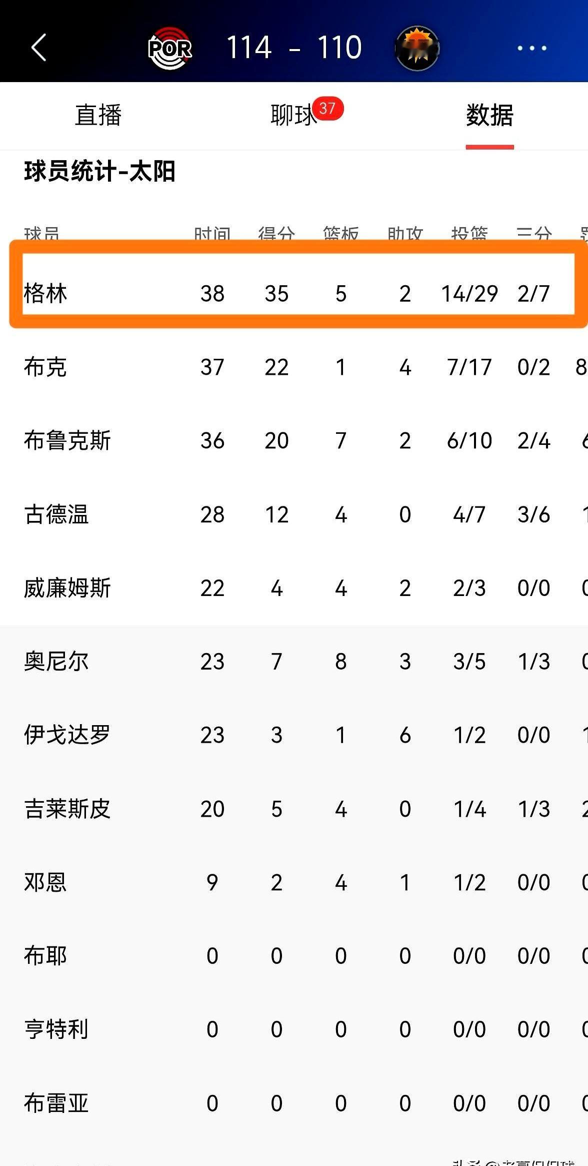 主场110比114输给开拓者,太阳这球打得太憋屈。杰伦-格林带伤砍下35分,末节独得11分,带队一度领先了11分。结果他在关键时刻连续出现低级失误,直接把领先优势送了回去。