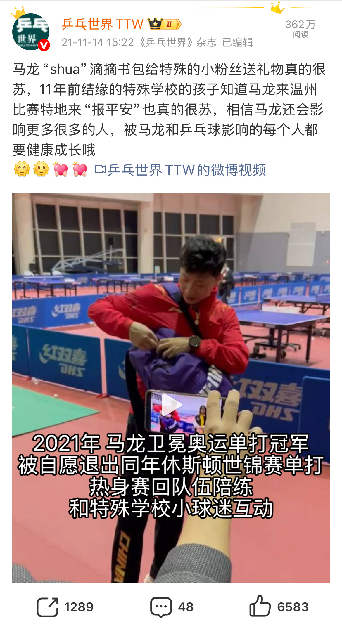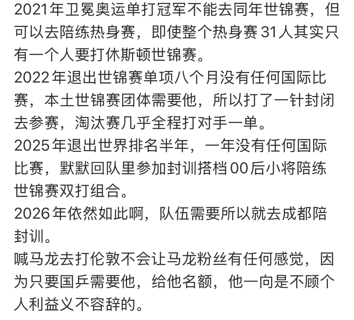 以及伦敦百年世乒赛中国队面临严峻挑战,虽然马龙不打的比赛我基本不看,但是既然马龙爱中国队希望中国队好愿意付出毫无怨言,作为粉丝我会支持他所热爱的一切,从竞体粉的角度来说我只会摒弃一切饭圈恩怨祝福中国队伦敦加油所有参赛队员教练员健康平安。给马龙踩踩小人。
