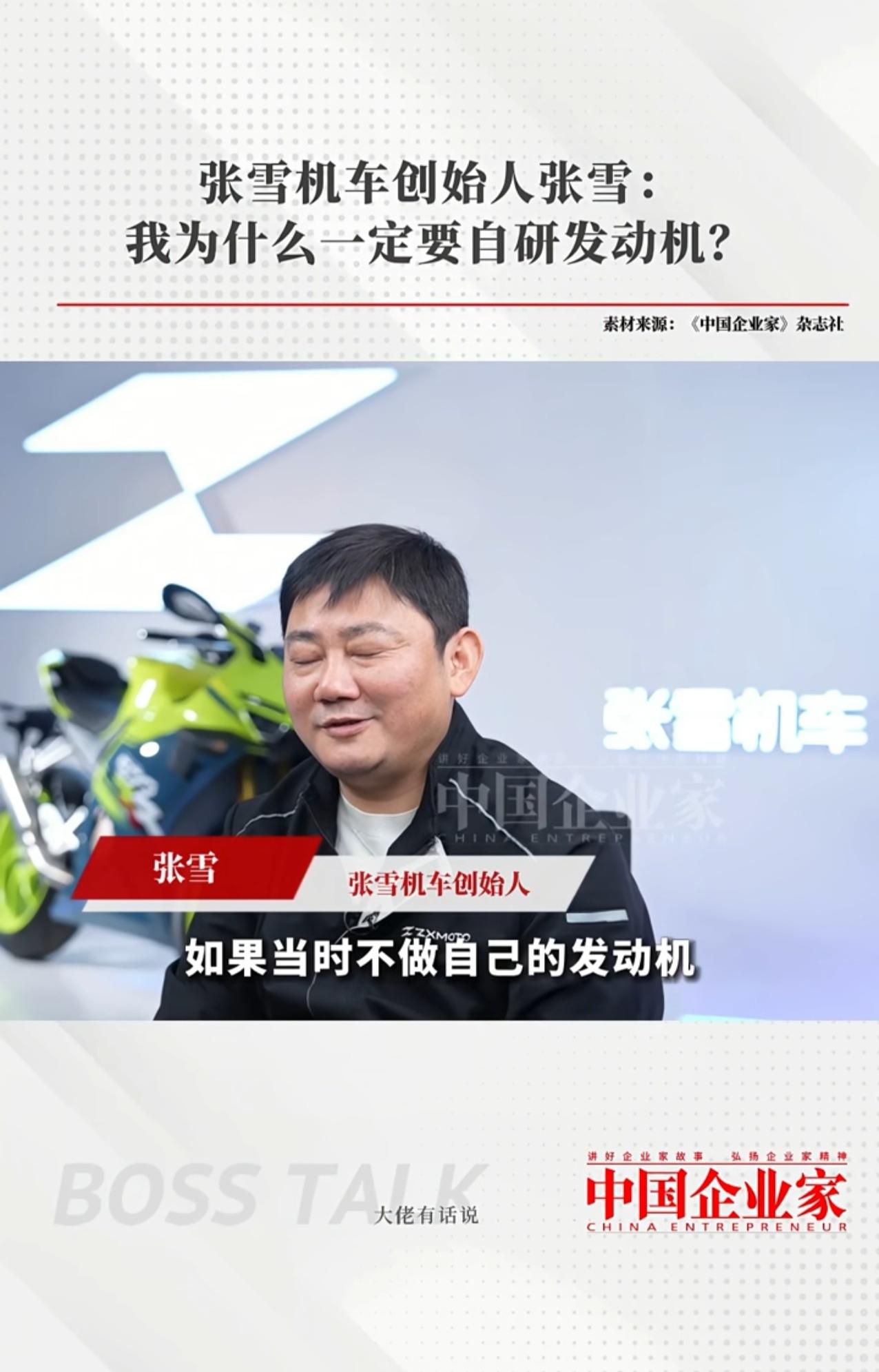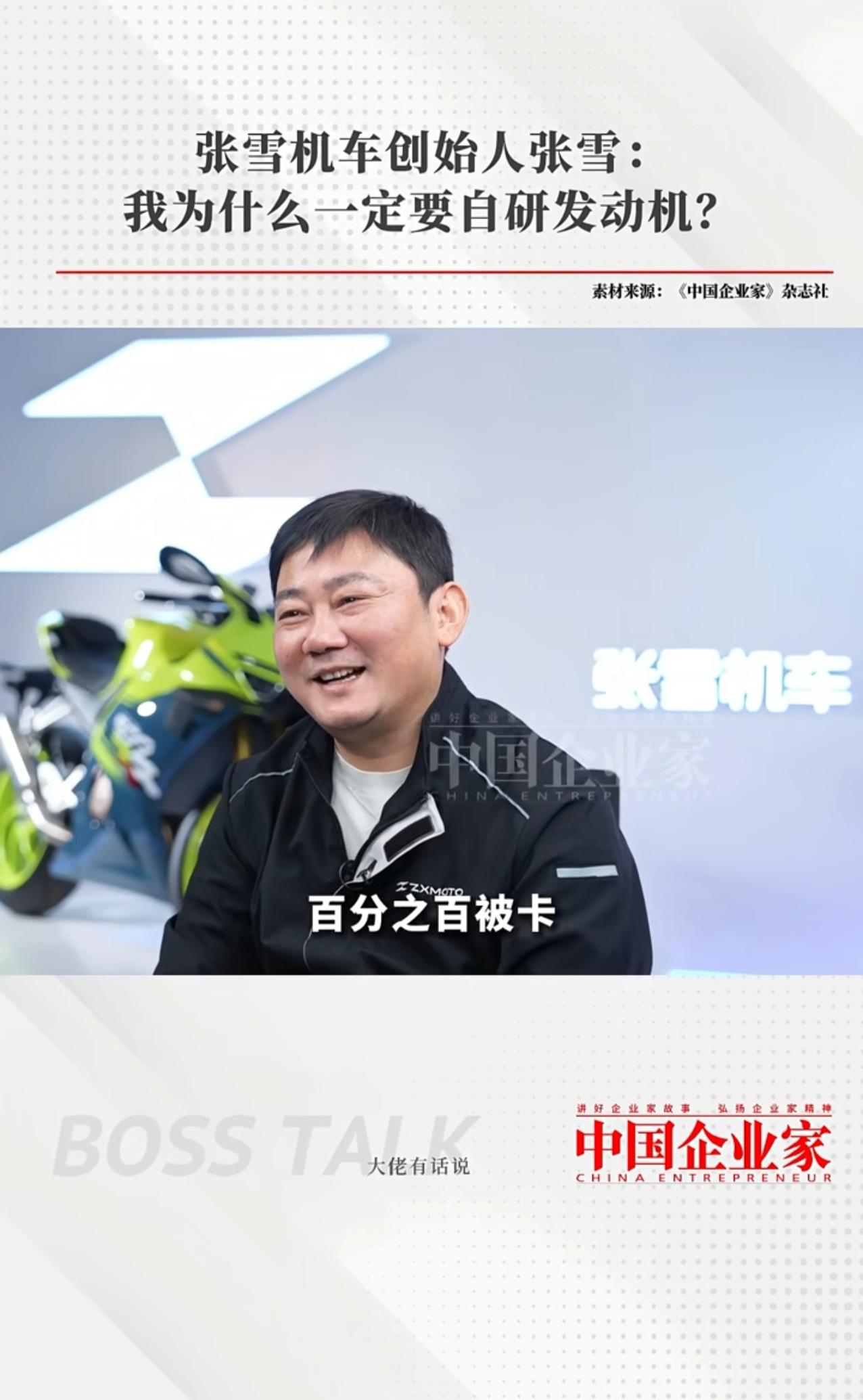 张雪机车创始人,说就像手机芯片一样怕被卡脖子,然后自己一定要研发发动机。他说如果自己没有发动机,百分百的会卡。