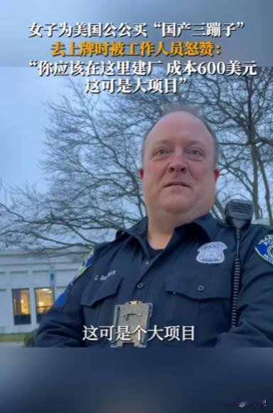 中国制造!2024年,女子为美国公公买“国产三蹦子”去上牌被工作人员怒赞:“你应