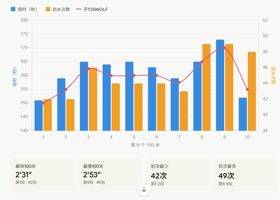 今天游泳先快后慢,继续努力,有个网友说我的游泳激励了他也开始游泳了,我现在是争取