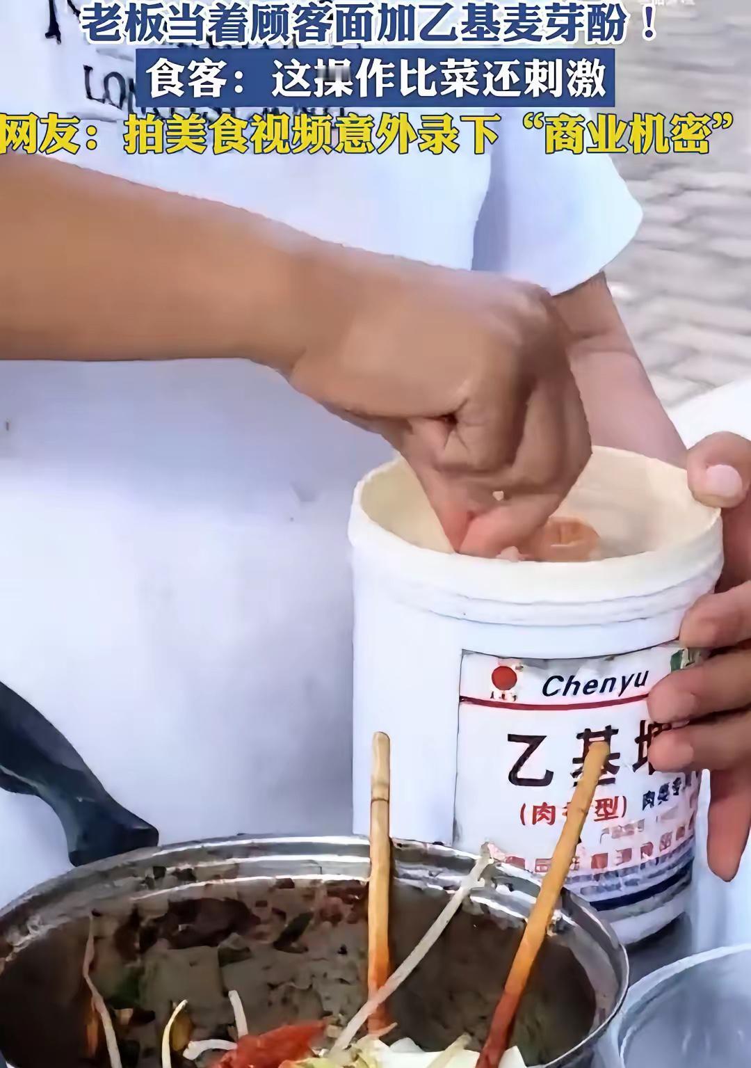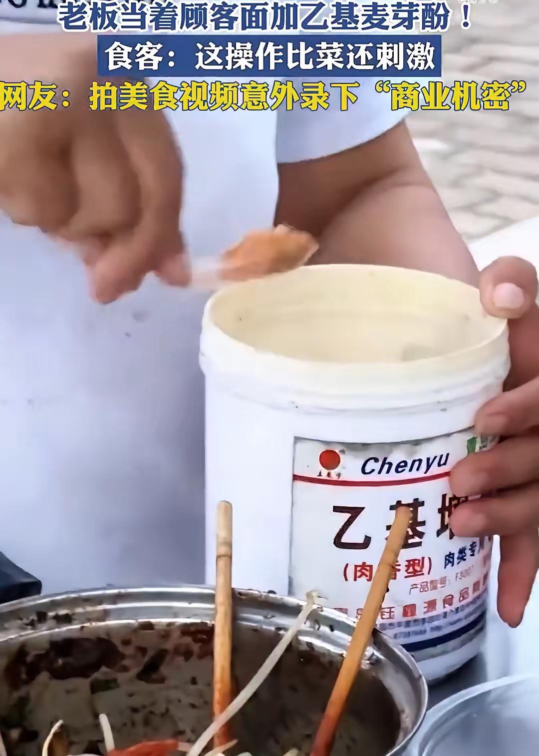 老板拿起一次性餐盒,夹了黄瓜丝、土豆丝和海带丝,然后开始加调料。盐、醋、辣椒油,一样一样往里放。我本来没太在意,直到她从摊位底下拿出一个白色的塑料罐。罐子上贴着一张磨得发白的黄色标签,上面清清楚楚印着“乙基麦芽酚”五个字。她拧开盖子,用一个不锈钢小勺,舀了满满一大勺,直接倒进了凉菜里。