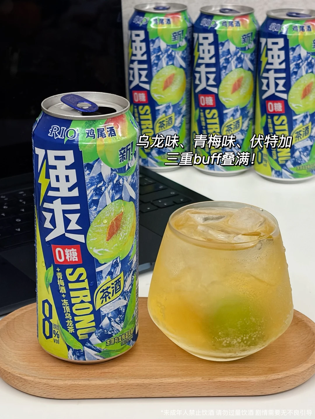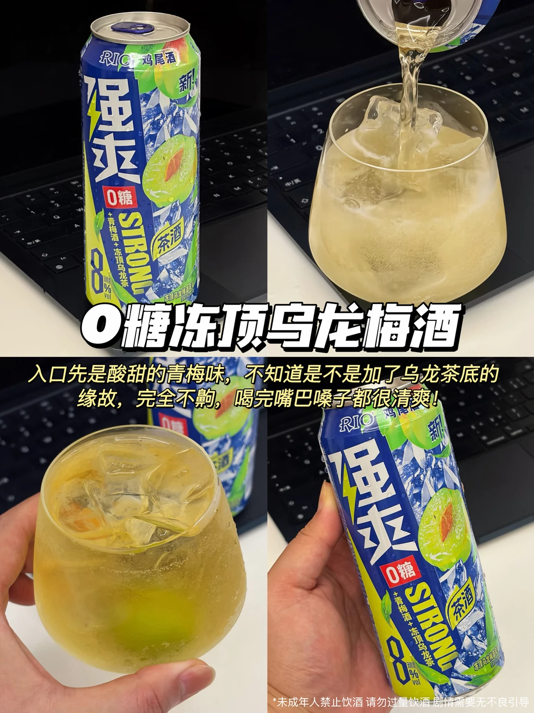 我一直都很喜欢喝梅酒,美中不足的点是喝完喉咙总感觉黏糊糊的,甜度太高特别齁嗓,这款0糖乌龙梅酒让我特别意外,入口先是酸甜青梅味,不知道是不是加了乌龙茶底的缘故,完全不齁,喝完嘴巴嗓子很清爽!茶味、梅酒、酒劲三重buff叠满。这款茶酒我预测会成为强爽封神的口味!