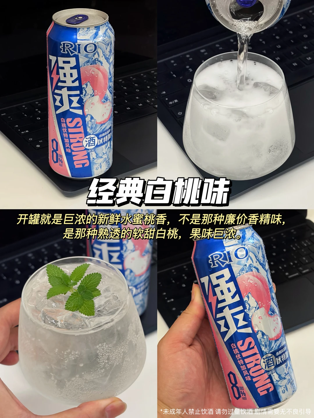 在强爽的经典果味中,白桃一定会出现在前排,据说它是无数小趴菜的入门味道。一开罐就是巨浓的新鲜水蜜桃香,不是廉价香精味,是熟透的软甜白桃,果味巨浓,几乎喝不出酒味,温柔里藏着点小烈,酒感不重,但上头贼快
