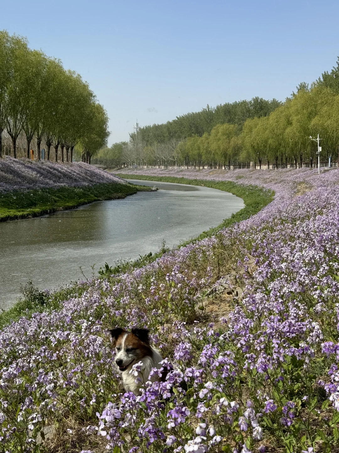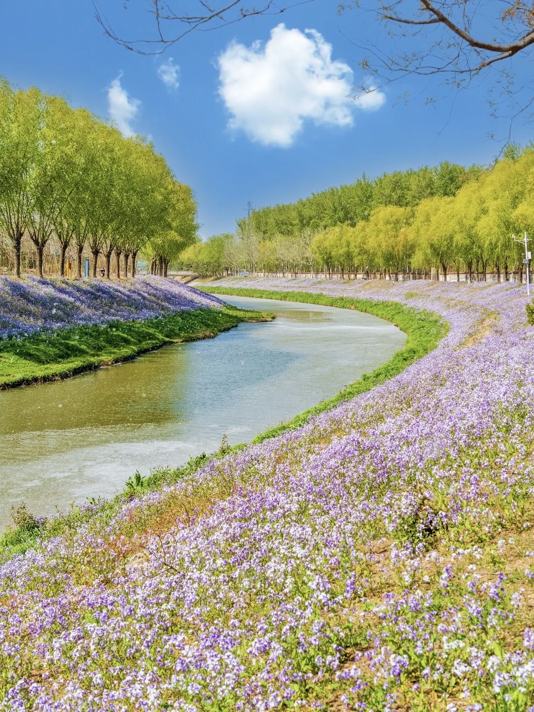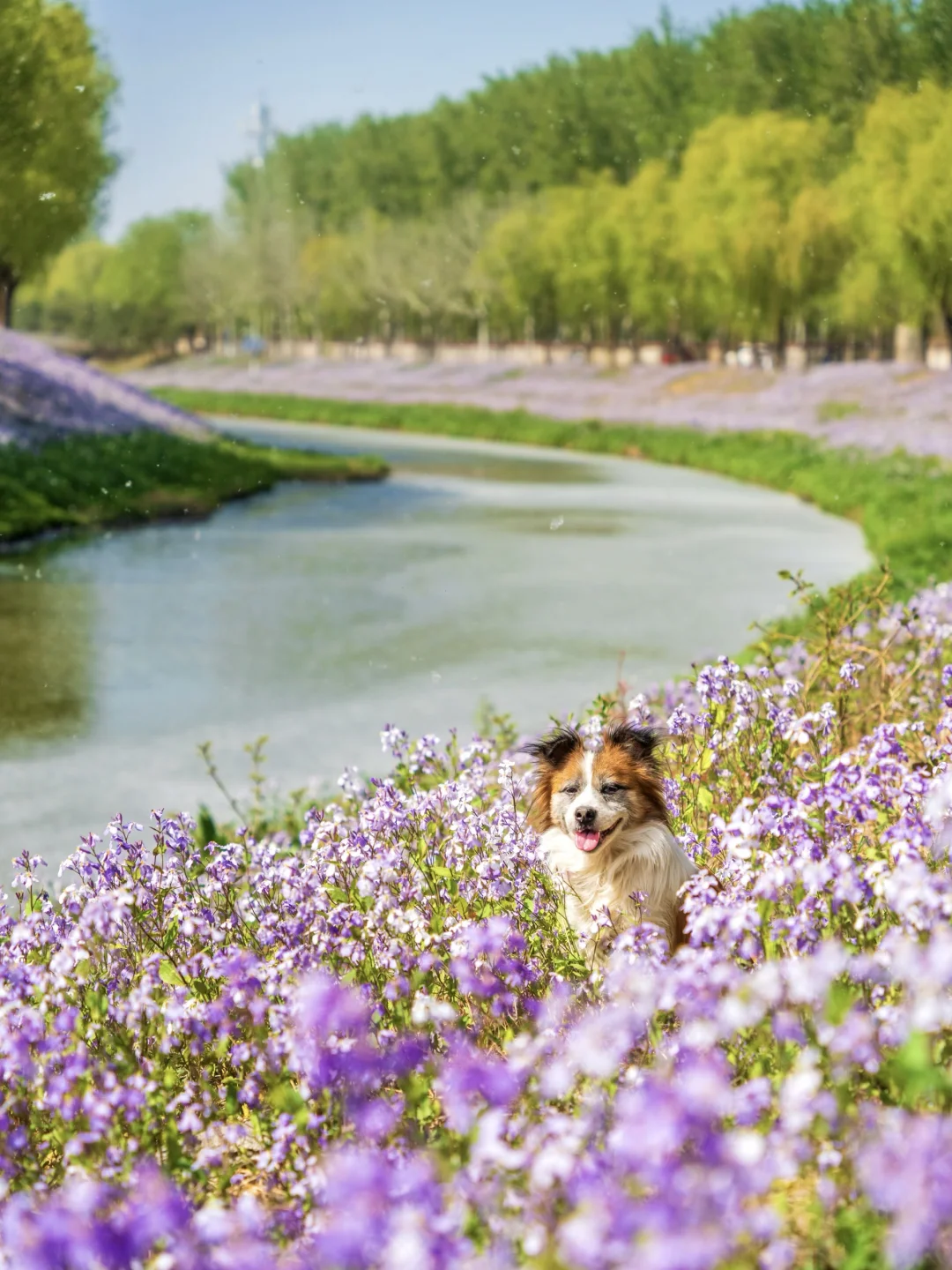 这里的二月兰真的特别特别好看,蓝天白云会更好看,二月兰花期很长,可以等待一个好天气去拍,现在有点柳絮水面会稍微差一点。