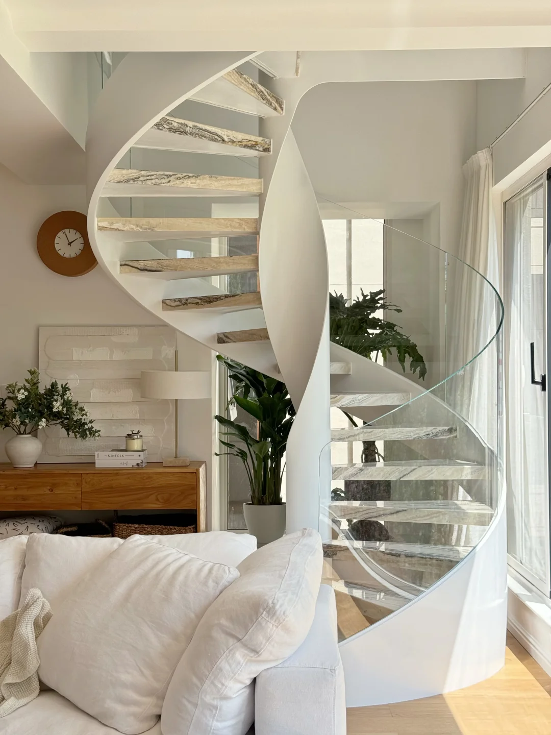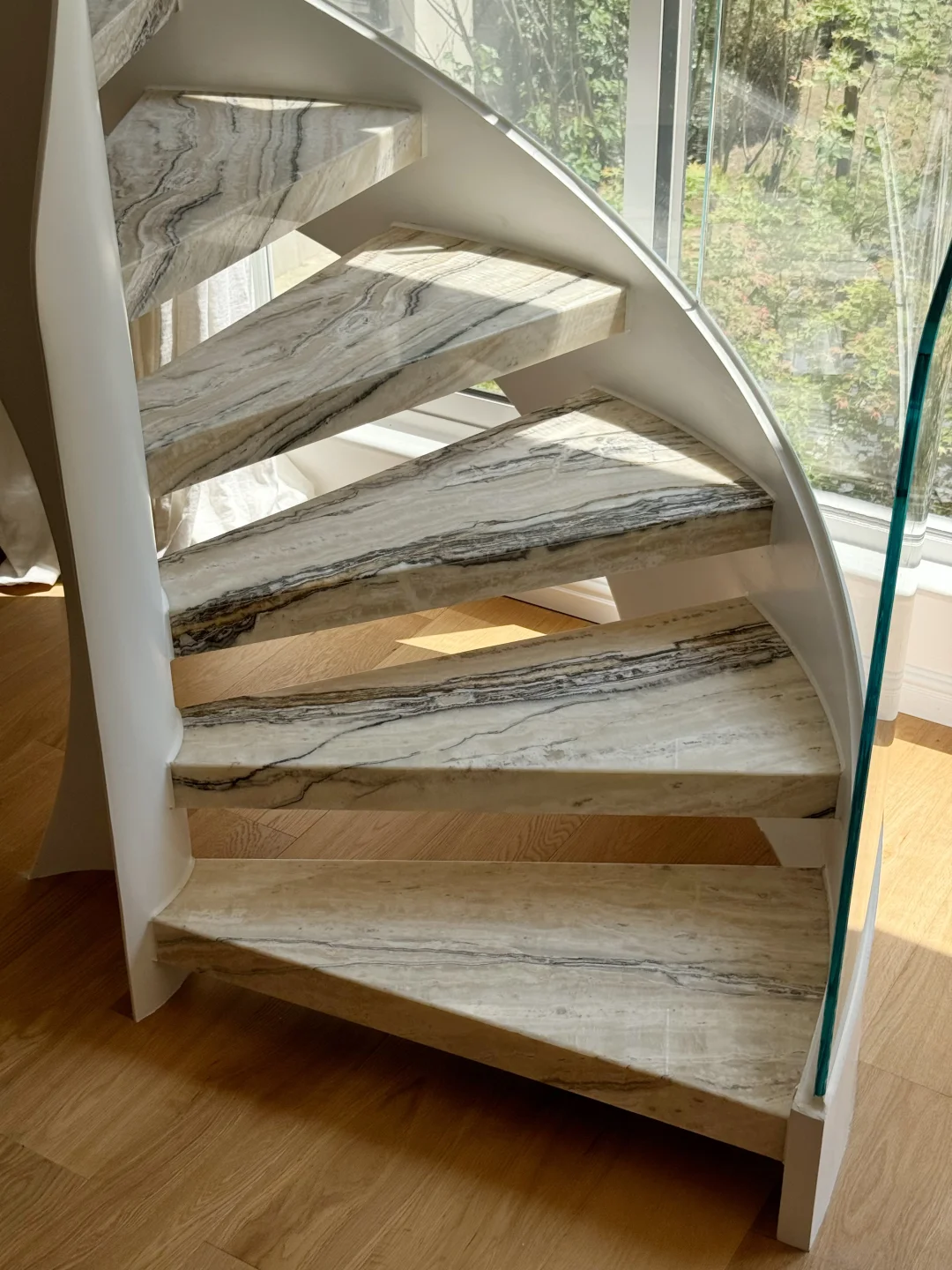 🍃白色钢构旋转楼梯,加装米黄色天然大理石,质感高级,和木地板也很搭