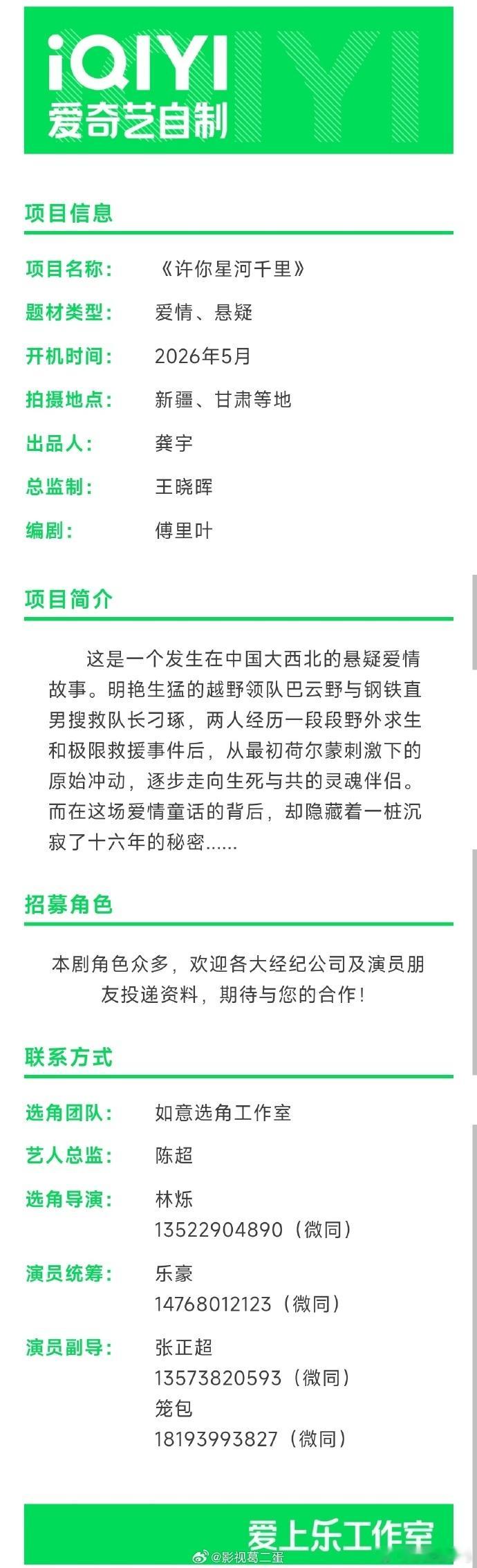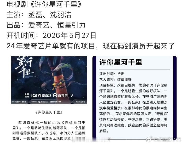 国内首部无人区救援题材悬疑爱情剧《许你星河千里》正式定档5月27日新疆开机,主演锁定丞磊、沈羽洁,改编自桃桃一轮同名小说,双强人设+荒野探案直接拉满期待!选角适配度狠狠戳中- 丞磊:饰演冷峻硬核的公益救援队长刁琢,自带沉稳硬汉气场,适配绝境救援里的专业感与破碎感,情绪戏爆发力拉满- 沈羽洁:饰演飒爽生猛的越野领队巴云野,明艳灵动又带韧劲,完美贴合女主“糙女领队”人设,和丞磊的双强组合荷尔蒙爆棚主打无人区救援+悬疑探案+生死爱情三线交织,无工业糖精:两人因无人区搜救结缘,意外牵扯出一桩尘封16年的至亲悬案,穿越沙漠、雪山、森林等极限场景,携手揭开地质资料被盗的阴谋,从气场不合到生死与共的灵魂伴侣,全程高能不拖沓。爱奇艺+恒星引力联合出品,总监制操刀《沉默的真相》,全程新疆、甘肃等地实景拍摄,110天拍摄周期还原荒野质感,专业救援+地质勘探细节拉满,坐等开机实拍!