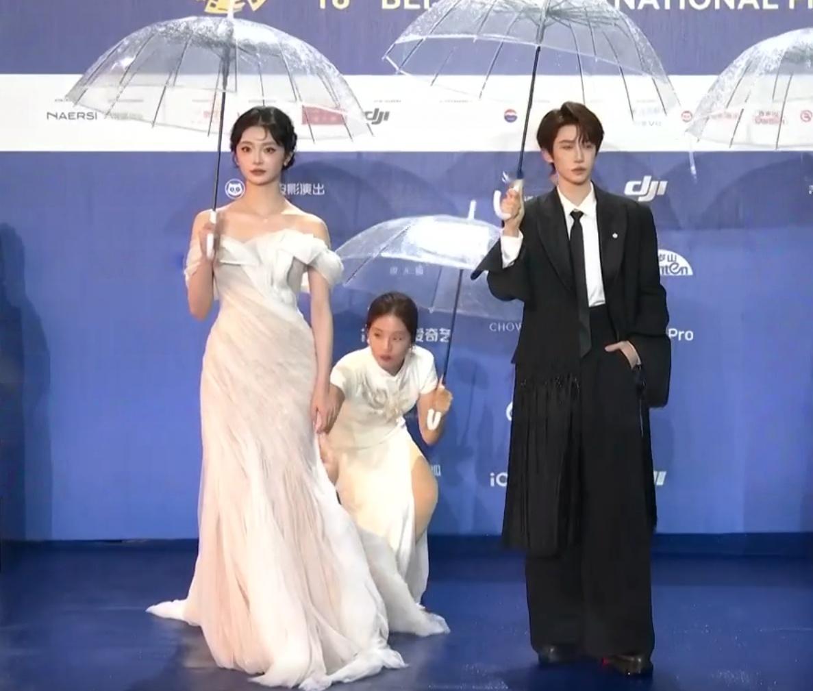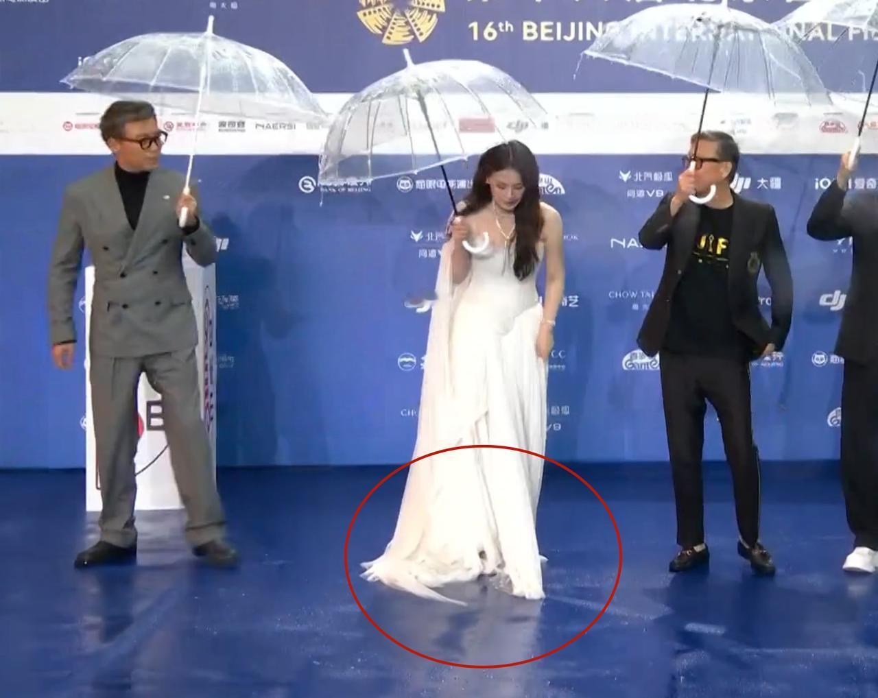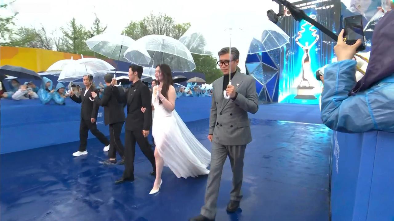 马思纯、戚薇、高圆圆、高叶、刘浩存、蓝盈盈、周洁琼……几乎所有女明星的裙子都沾湿了,成了行走的抹布。艾伦在后台笑说,戚薇本来是想飘着走过红毯,结果她用裙子给红毯拖了一遍地,“我想帮她拧一拧水,结果没来得及就上台了。”
