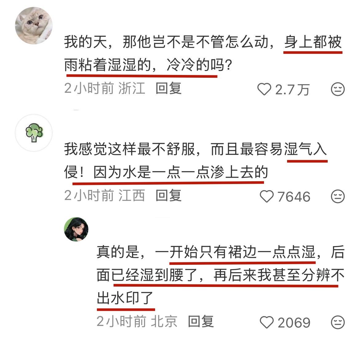 一开始只是脚边沾湿,2小时后水渍一路蔓延到腰部,整个人都“泡”在雨水里,吸饱水的礼服又湿又重又冷,女主持人在十几度的室外被冻得瑟瑟发抖。