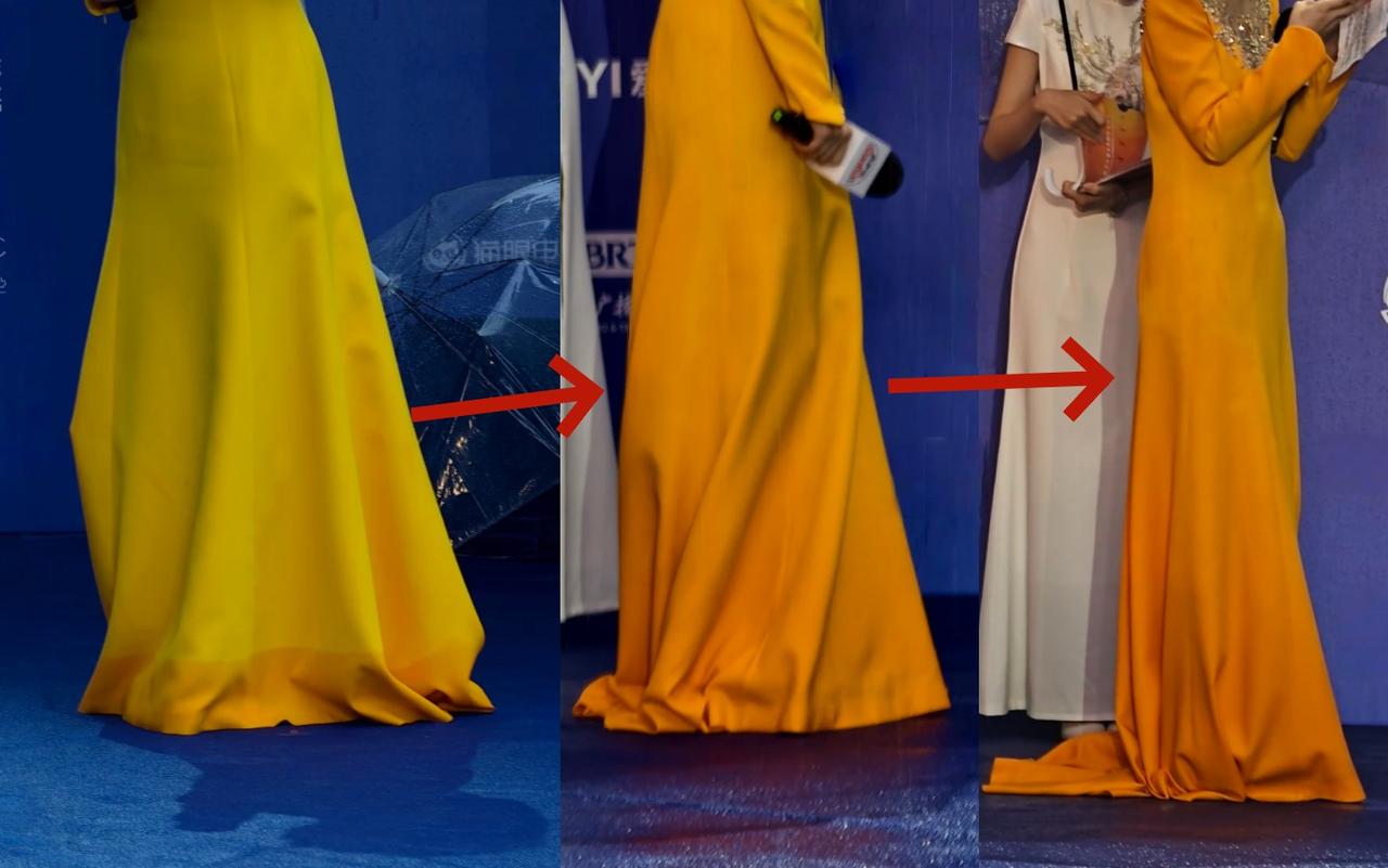 北影节雨中红毯,女主持人的裙子吸水变色,从刚出场时的明黄色,渐渐变成了橙色。