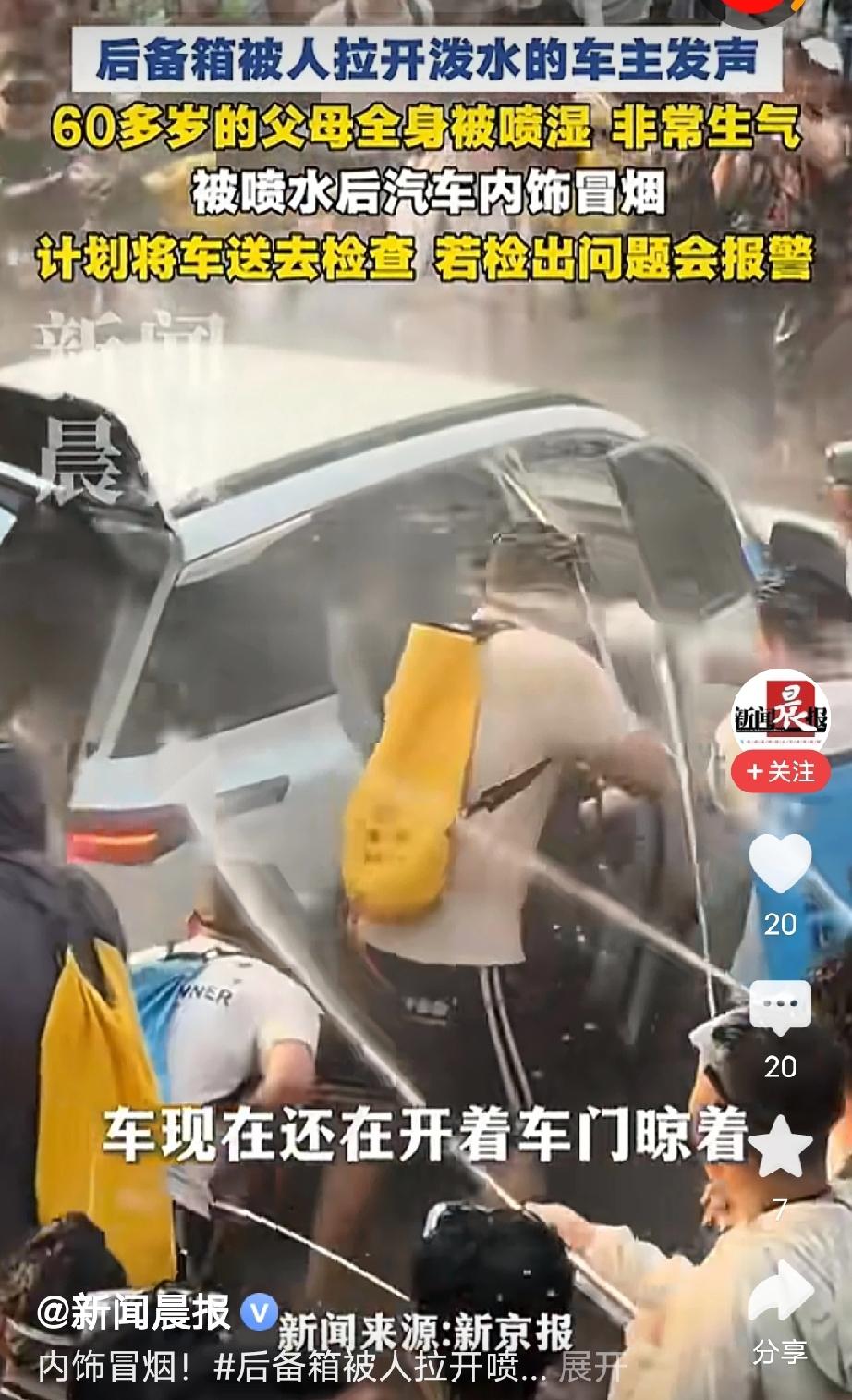 陈先生心急如焚,一边护住父母,一边拼命拍打方向盘嘶吼,可周围的嬉闹声盖过了他的呼救,人群越围越密,水枪与水管的水流愈发猛烈。