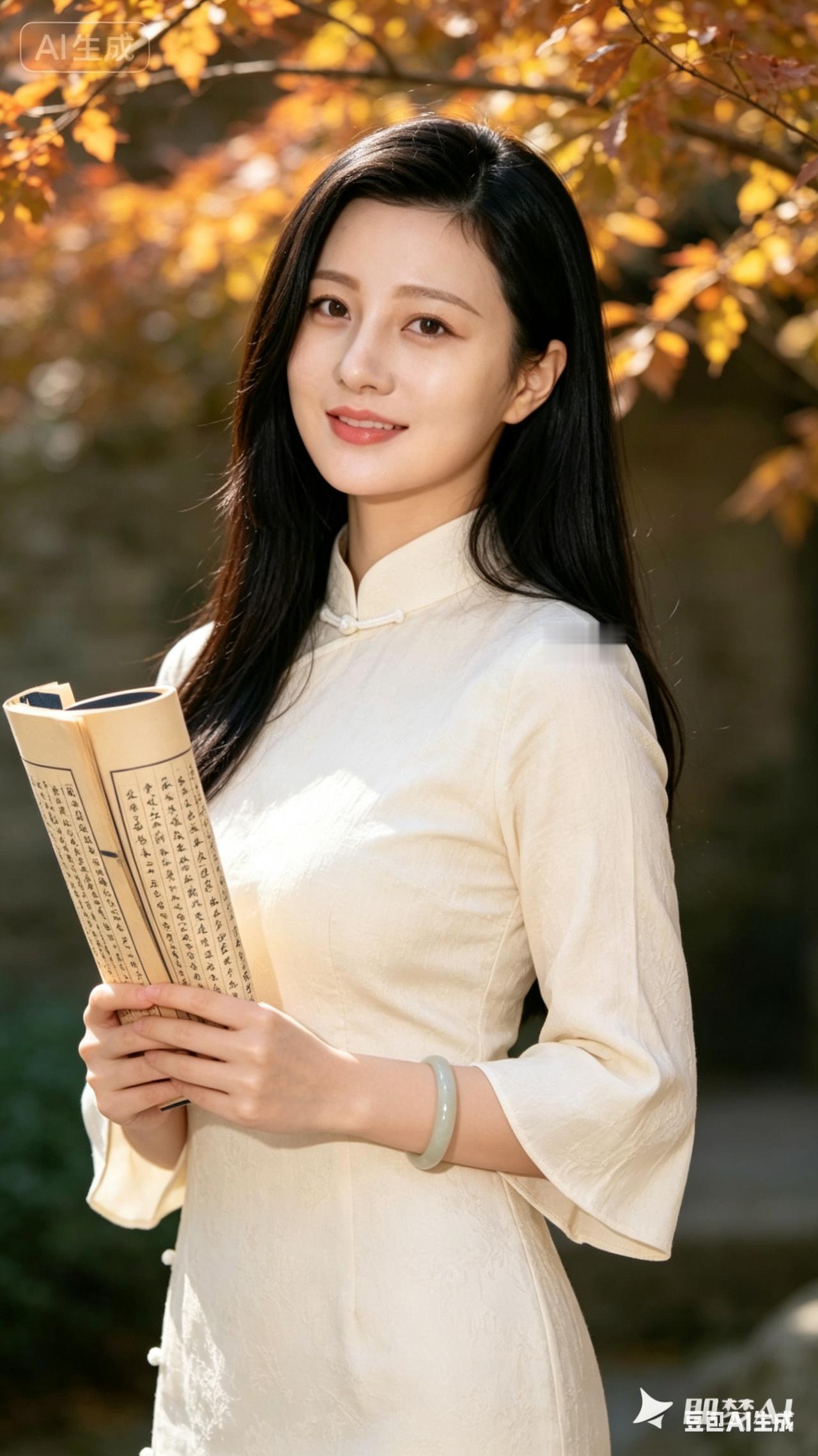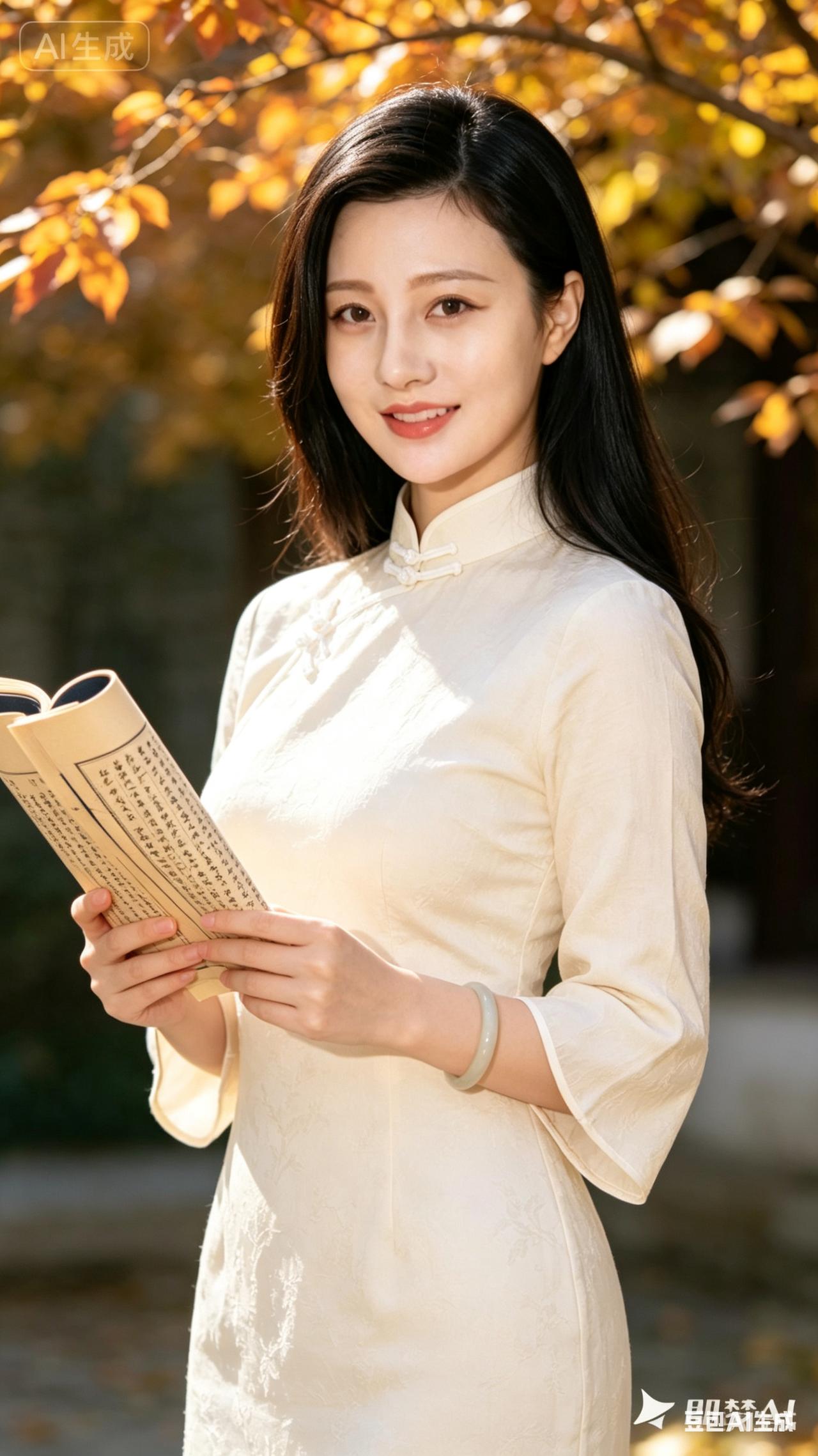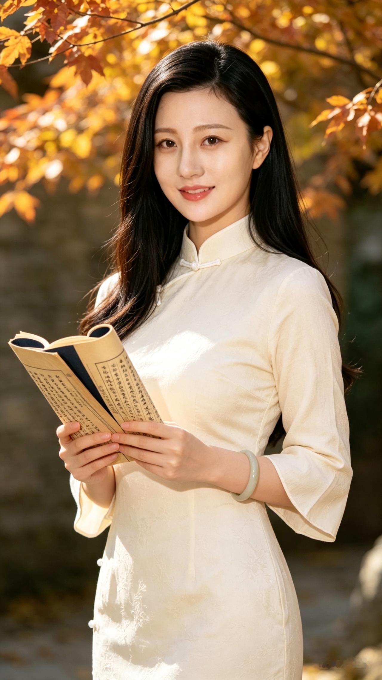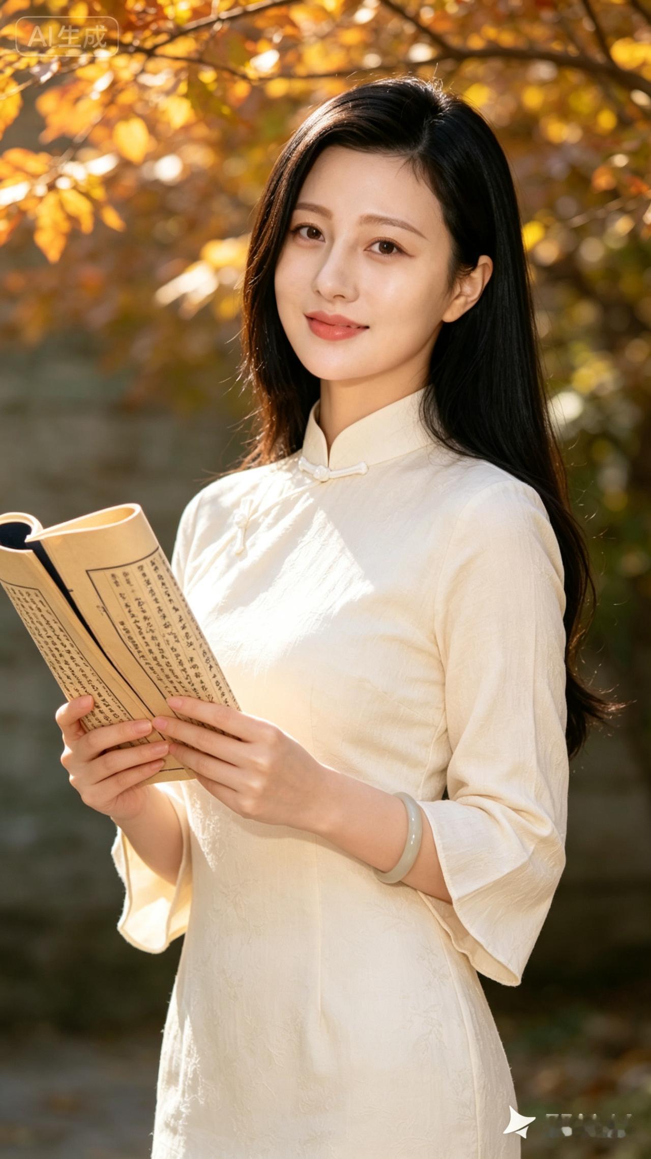 秋日暖阳下,优雅的旗袍少女,沉浸在书香之中。