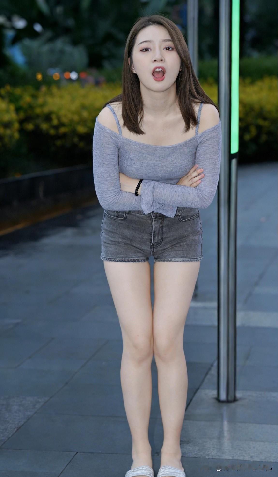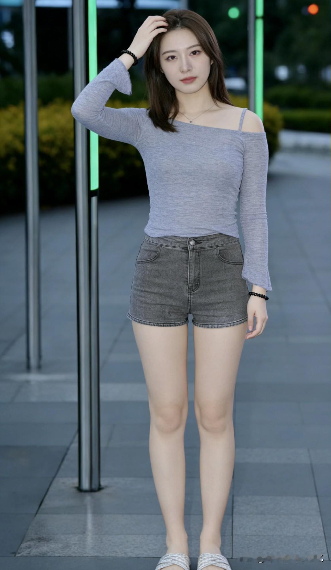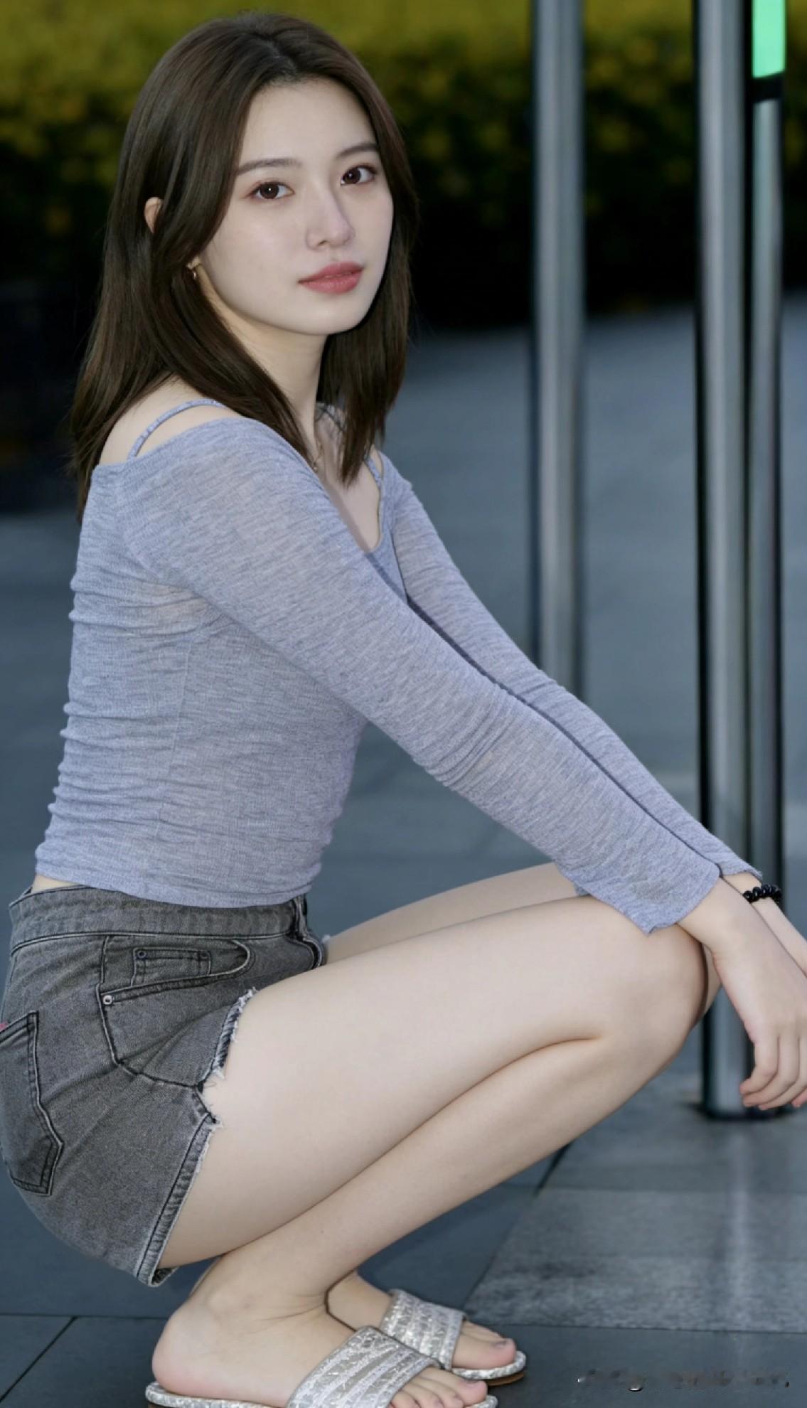 小夏今天穿得像偷穿男友的T恤——灰露肩衫松松垮垮,却把腰勒得细细的,牛仔短裤卷边卷得随性,活脱脱“我超会穿但我就随便穿”。蹲下来的时候,她总爱把脚尖蹭两下,像猫科动物在确认领地,可那银拖鞋一闪,又暴露了“我其实很精致”的小心思。你看她头发,发尾有点毛毛躁躁,像刚从被窝爬起来,可眼神亮得很,仿佛在说“别管发尾了,看我腿长!”,这种“一半慵懒一半嚣张”的劲儿,像极了周末只想躺平却忍不住化妆出门的你。