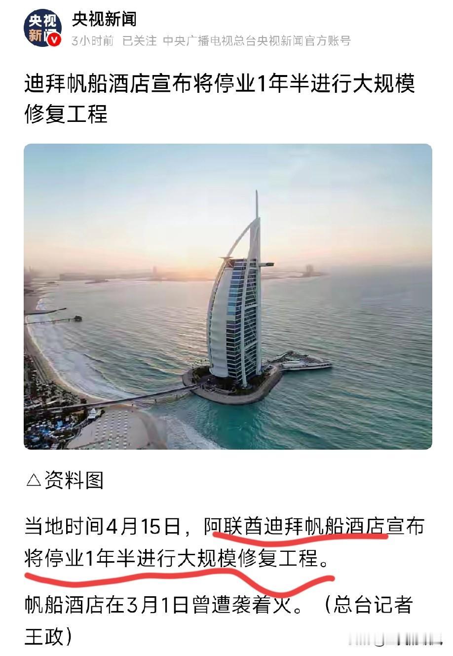 帆船酒店停业修复!美伊停火未稳,迪拜现在动工有点早! 据央视消息:迪拜七星级