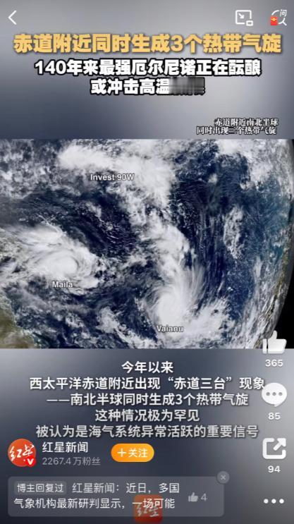 气象观测数据显示,这种现象在历史上极为罕见,赤道附近的大气环境本就不利于多个热带气旋同时形成,而此次奇观的出现,正是太平洋海气系统异常活跃的直接佐证,也从侧面印证了厄尔尼诺正在酝酿的信号。