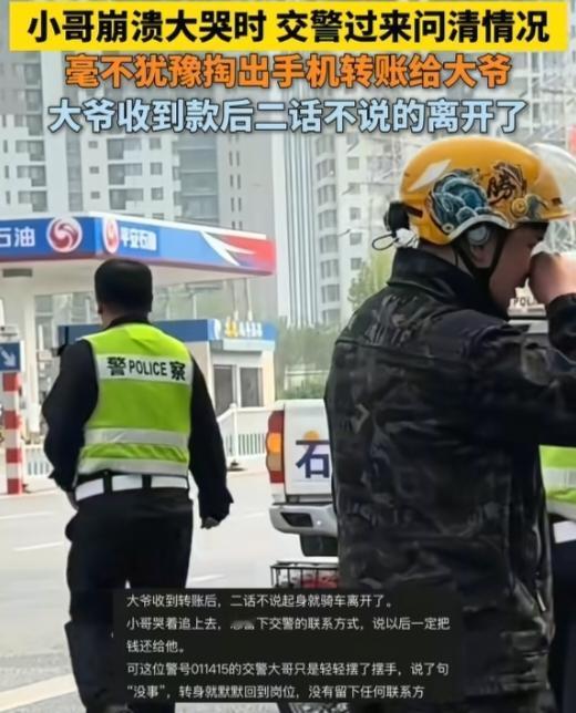 两位交警也转身离开了,外卖员哭着追上去,想留下交警的联系方式,说以后一定把钱还给他。