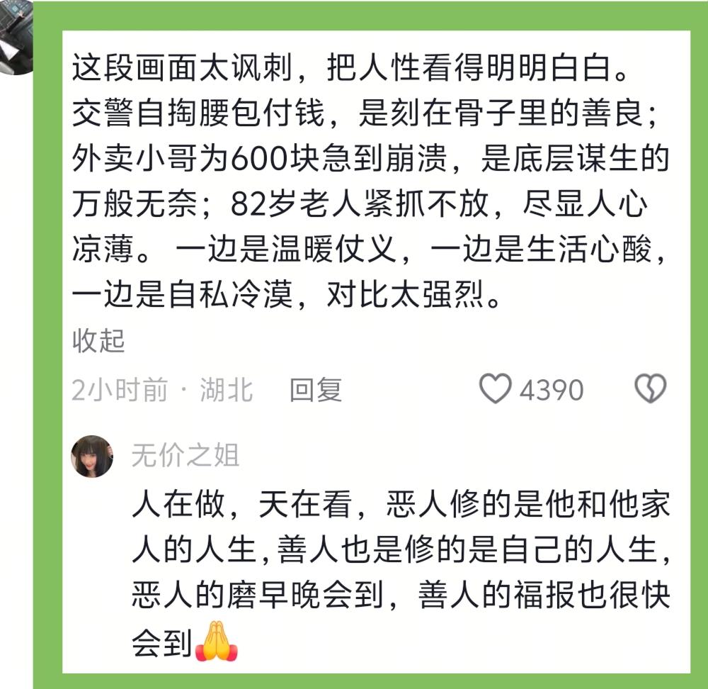 这一幕令人感动落泪,年轻的外卖员出门谋生本就不易,这位交警没有多说一句漂亮话,却用最实在的行动,护住了年轻人的尊严,也温暖了在场所有人。