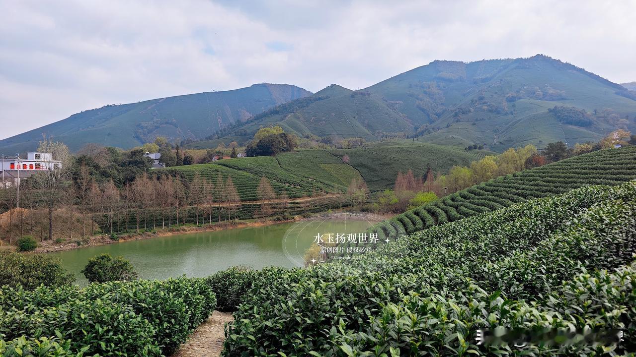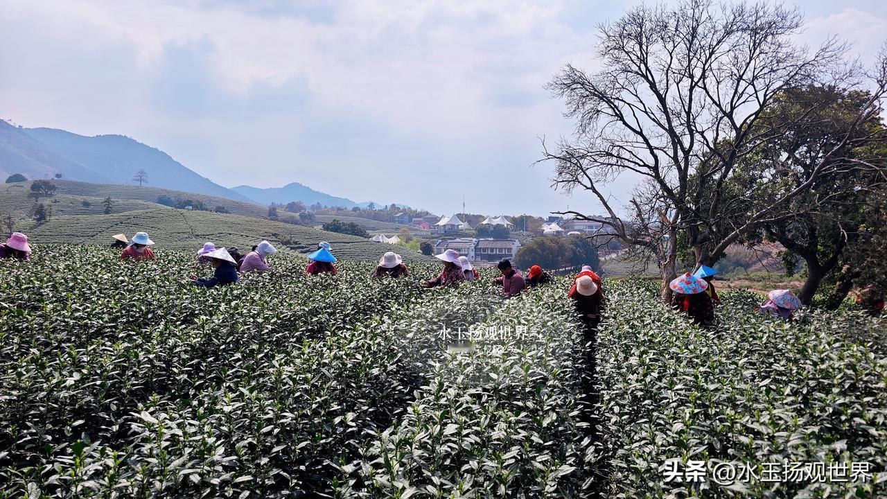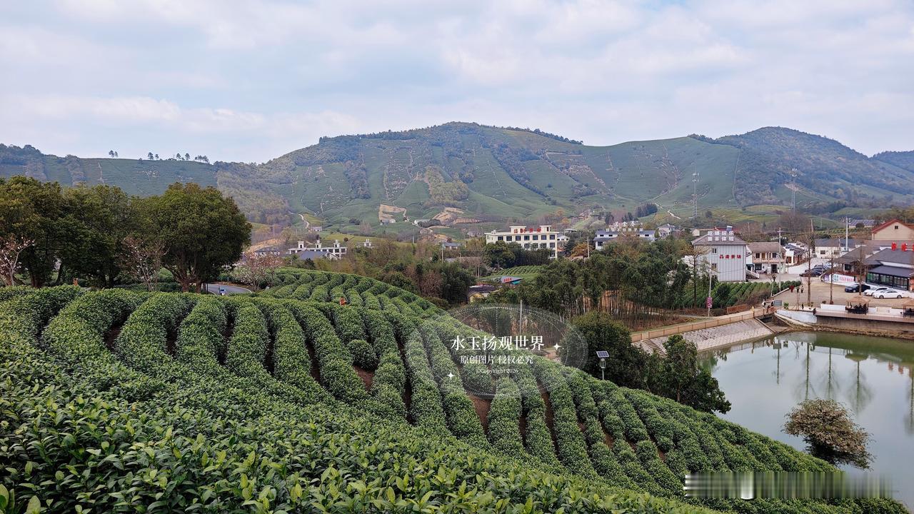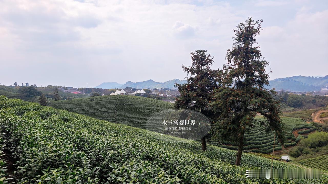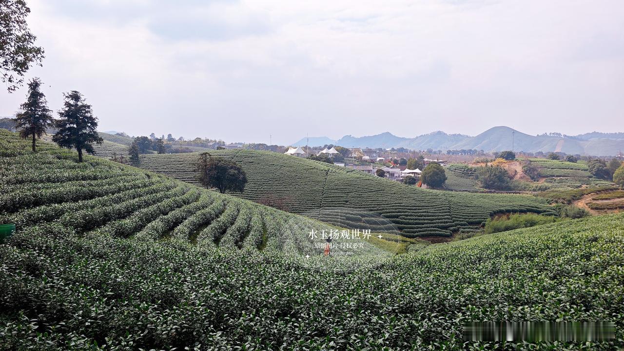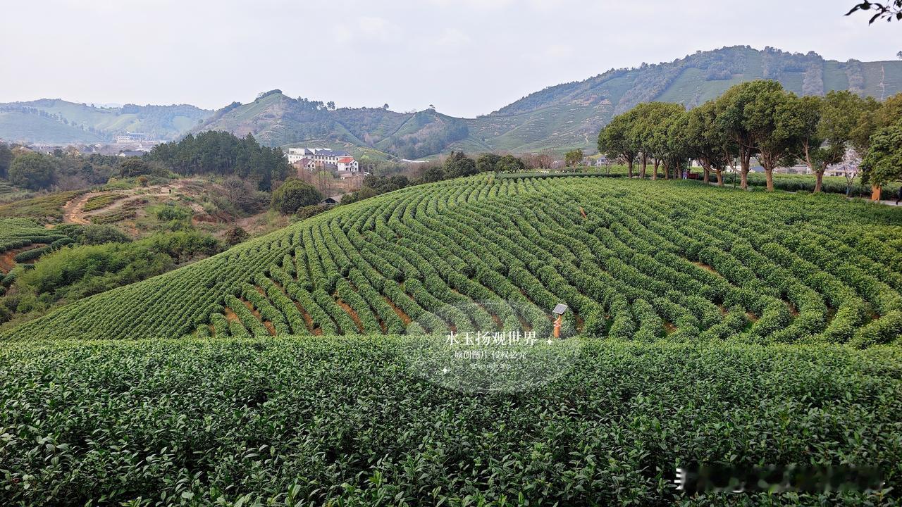 站在观景台的那一刻,所有语言都显得苍白。你见过绿色的海浪吗?这里的茶垄像被精心梳理过的绿色绸缎,从脚下一直铺到天边,春风一吹,层层叠叠的绿就跟着起伏,连空气里都飘着淡淡的茶香。最绝的是清晨,薄雾缠绕在山腰,阳光穿过云层洒下来,茶尖上的露珠闪着金光,远处的村庄若隐若现,活脱脱一幅流动的江南水墨画。