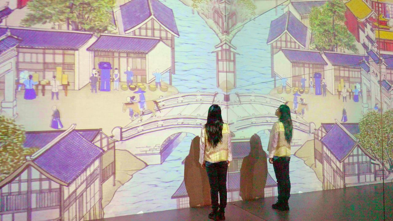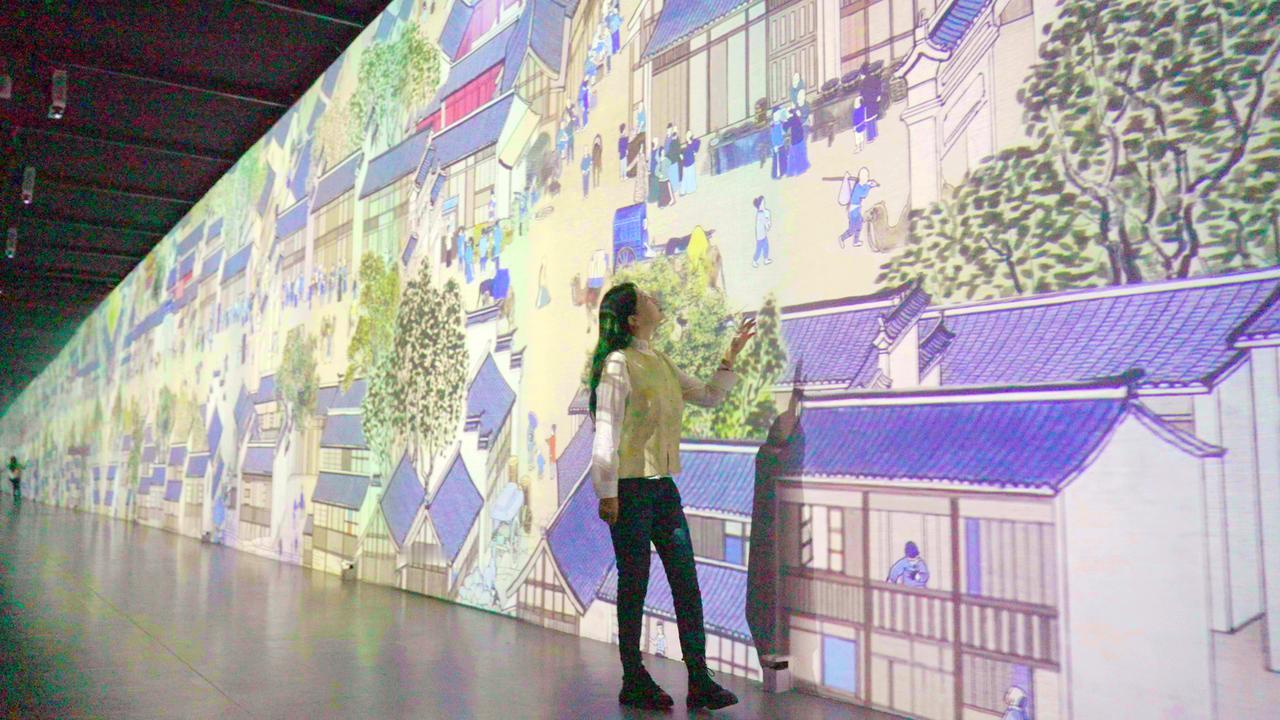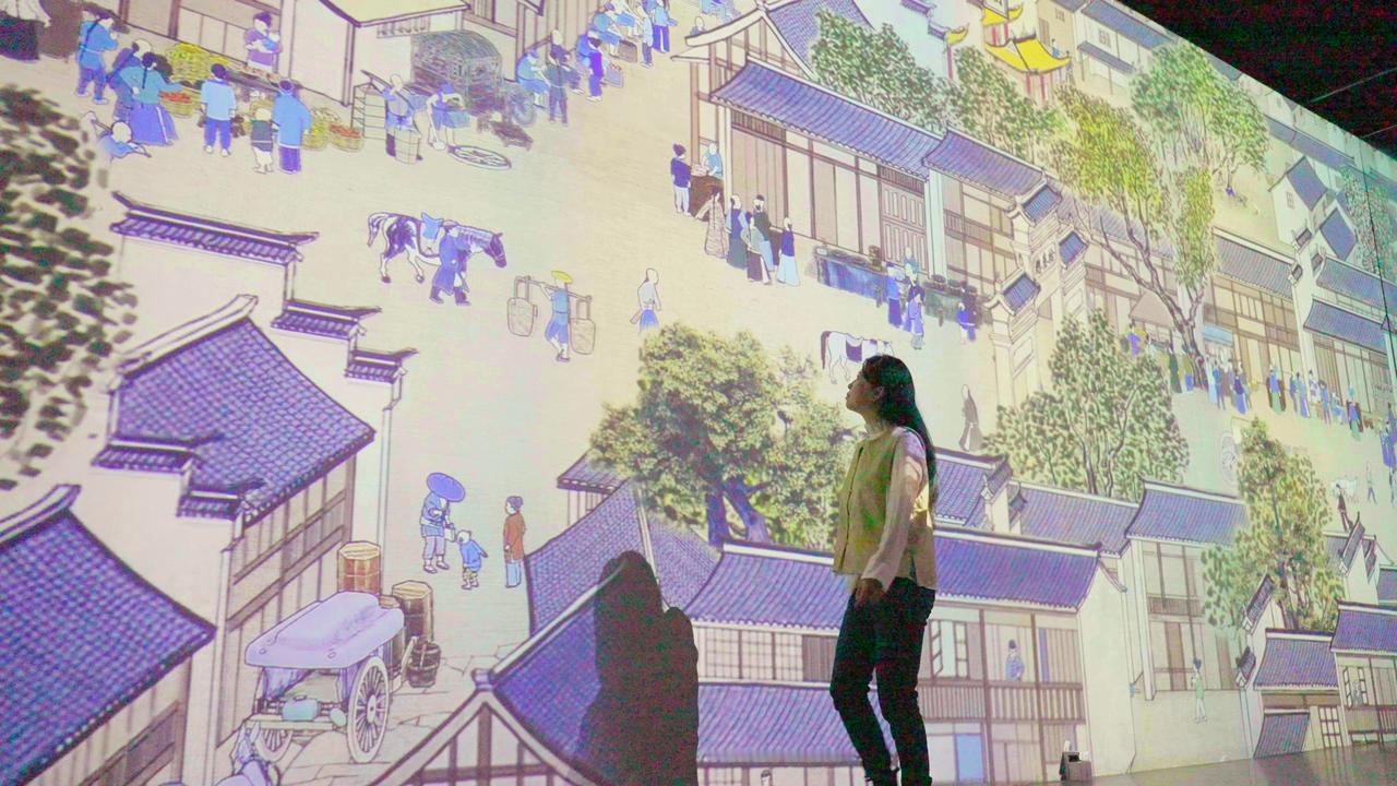 这边有一个类似《清明上河图》一般的光影投影,还原了湘潭的窑湾历史街区的昔日商贸繁华;