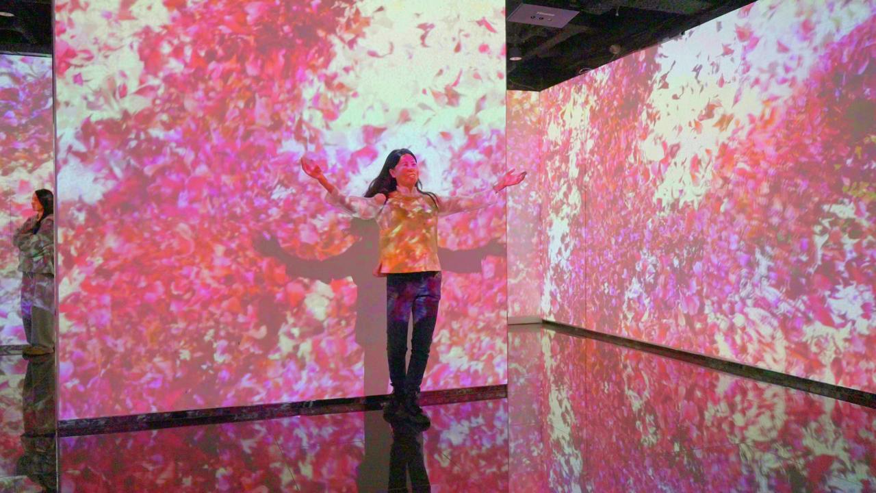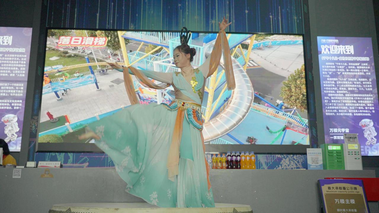 还没进楼内,门口就有敦煌舞和火焰表演,有点穿越。其实楼宇内部就是一个光影的穿越元宇宙——