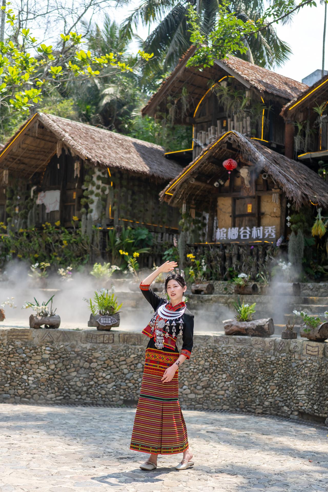 从三亚市区过来二十公里,槟榔谷就隐蔽在热带雨林中的小山坳,以前就是黎族的原生态山寨。原住民没有离开村庄,变成了景区的工作人员。