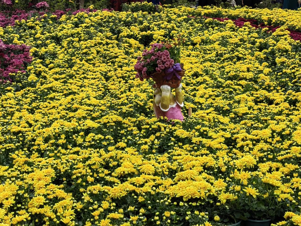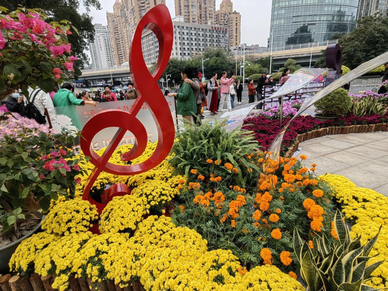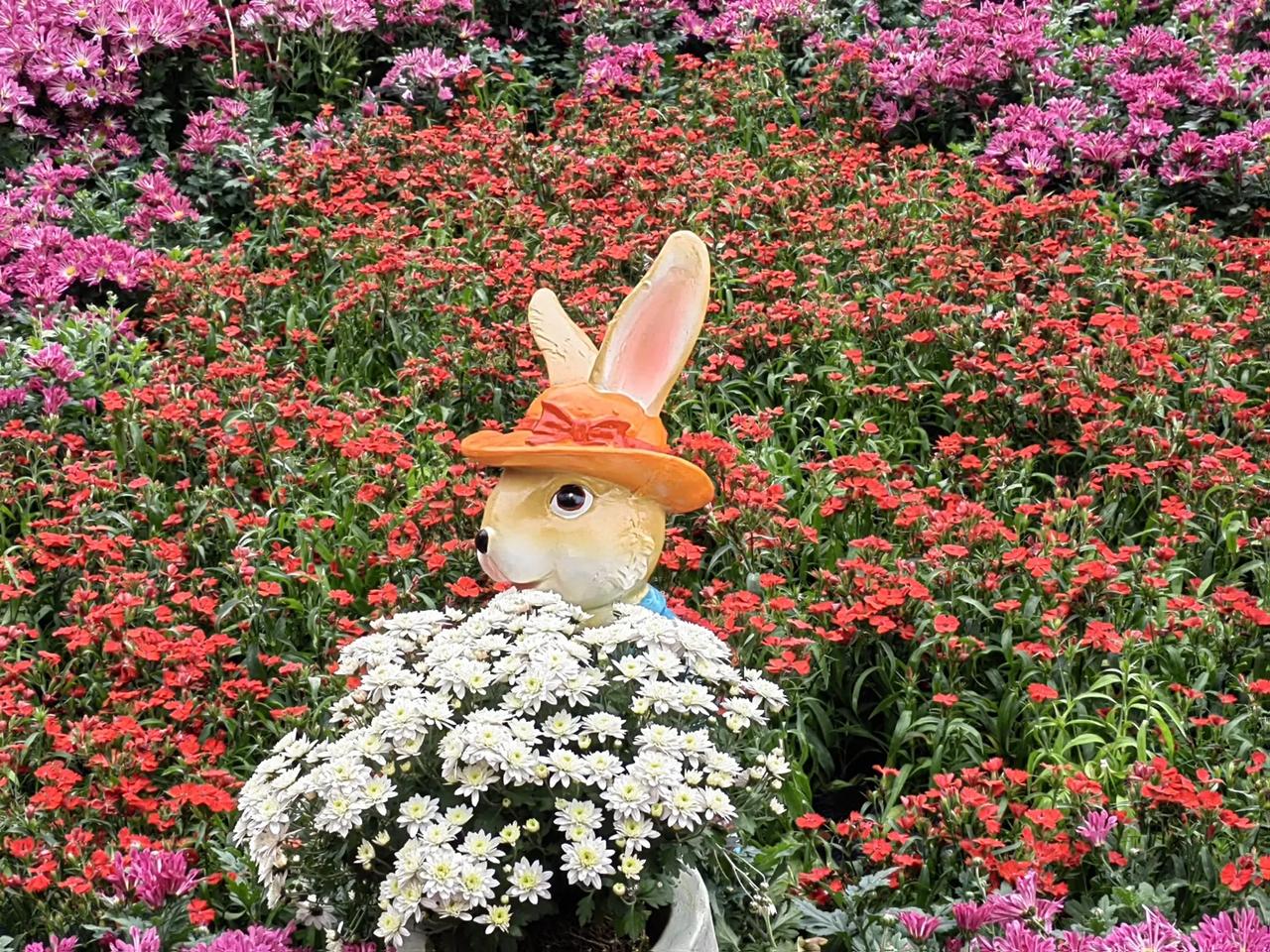 “菊舞音律”花坛中的音符;“绮梦花田”菊丛里的兔子花童们;“映花流韵”小船上的火烈鸟;“心之花火”的电话亭、小单车和竹椅值得观赏。