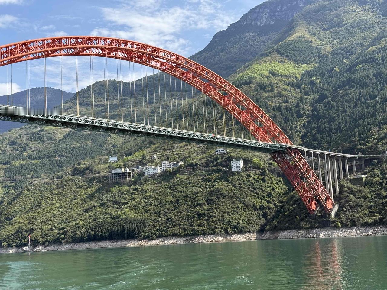 继续前行,前方一座跨虹桥,隐约可见,巫山县城就在桥后。红色的桥,红色的船,如某种欢迎仪式,令人突然想起,应该看一下股市行情,收盘果然大红!
