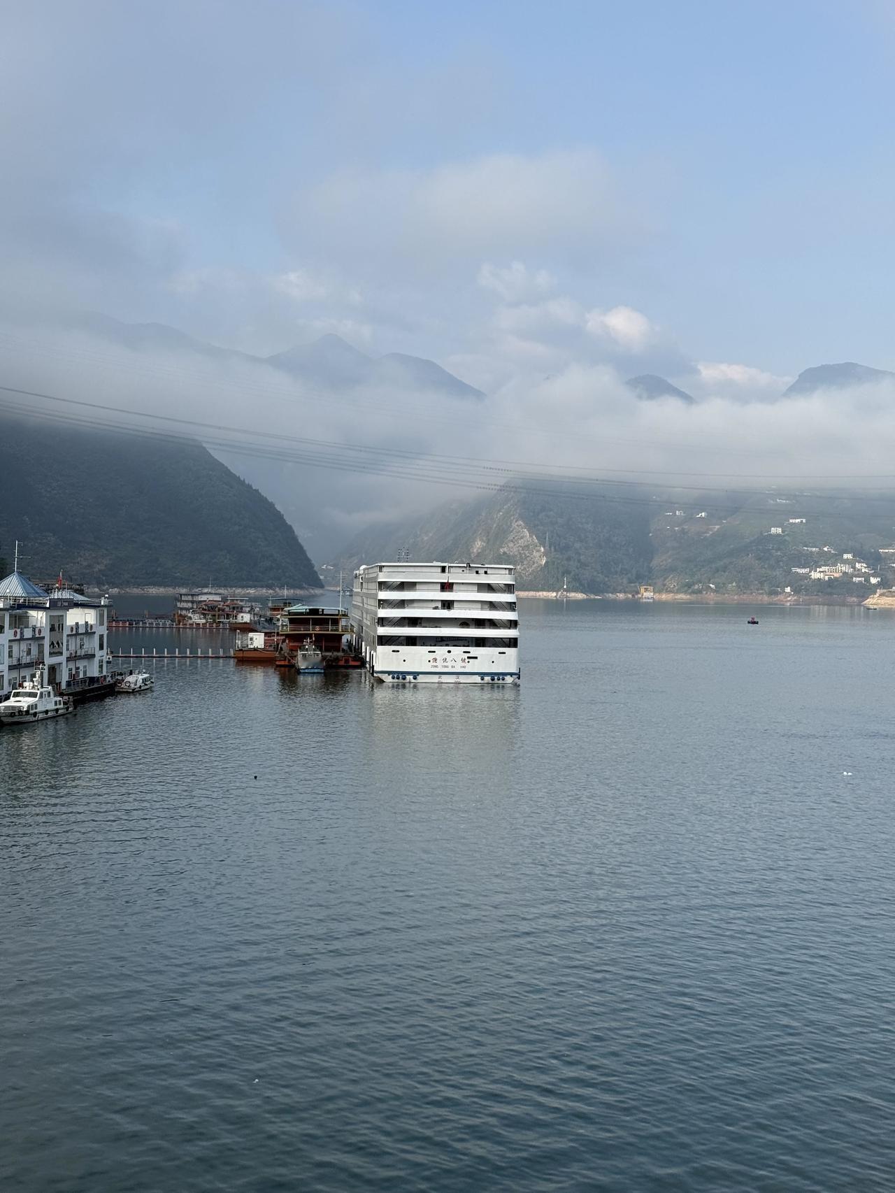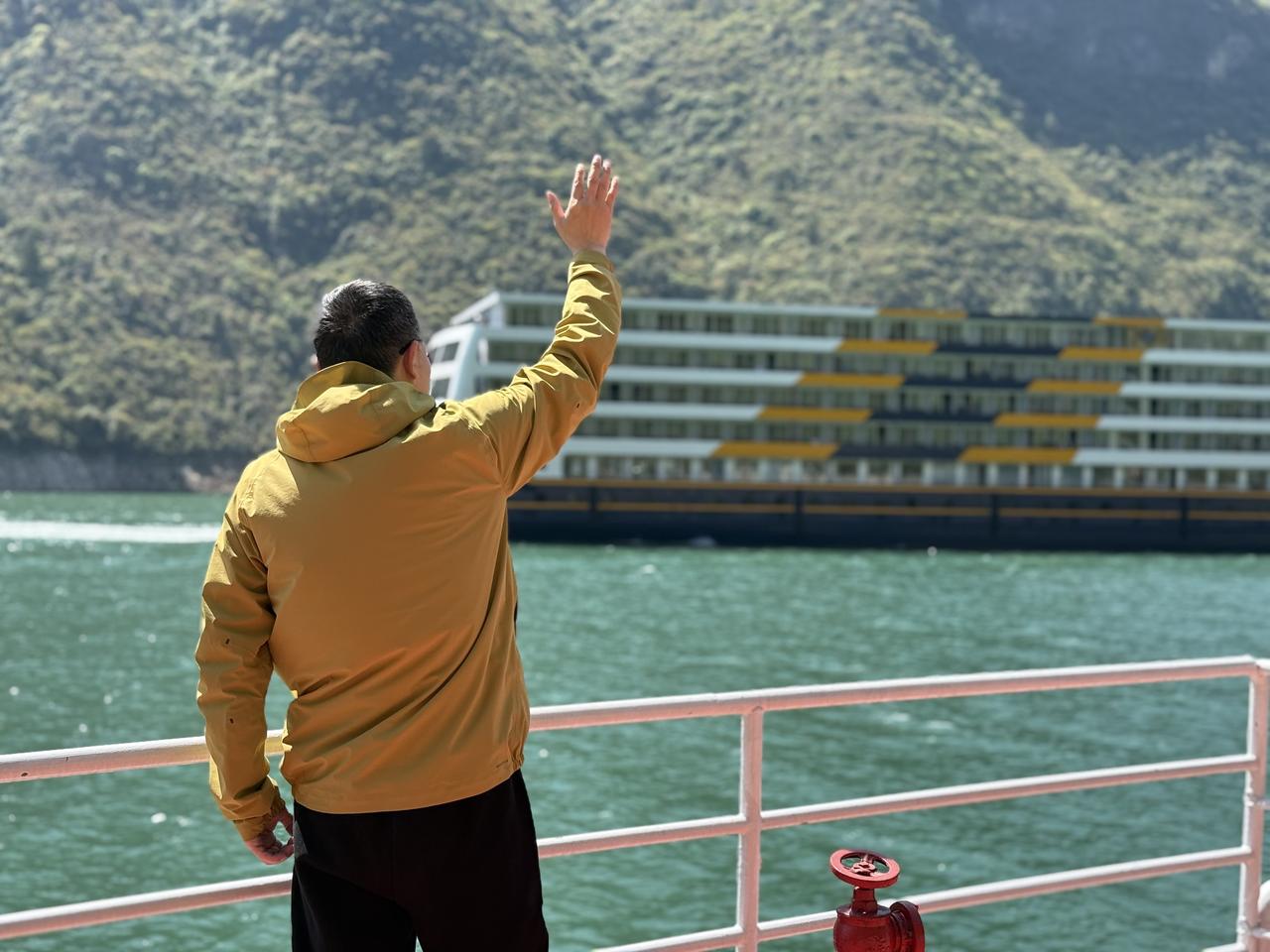 14点,小红船准时启航,没有丝毫迟疑。再次进入三峡模式。高大的游轮赶上了小红船,成了他们眼中的风景。本该“自卑”的时刻,却因一位心思极简的同船游客伸开双臂大声招呼,让我这位i 人也伸开双臂,对着游轮——又或许是对着磅礴的山水——大声欢呼。