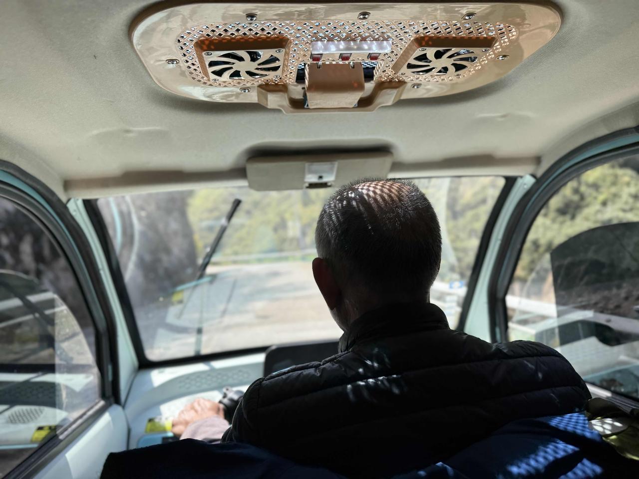 在渡口杂货店与老头聊天,他说可以用车送我们去培石乡,来回包车20元,我想想也行,不料老头搬出一辆“老头乐”,费好大劲调了头。