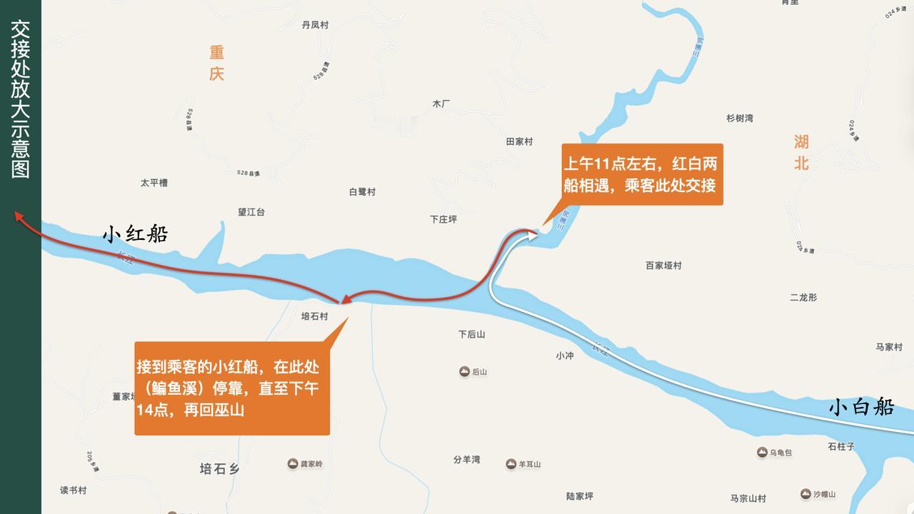 2、11点左右,在湖北重庆交界(三溪河),与巫山来的小红船相遇,两边的乘客互换。