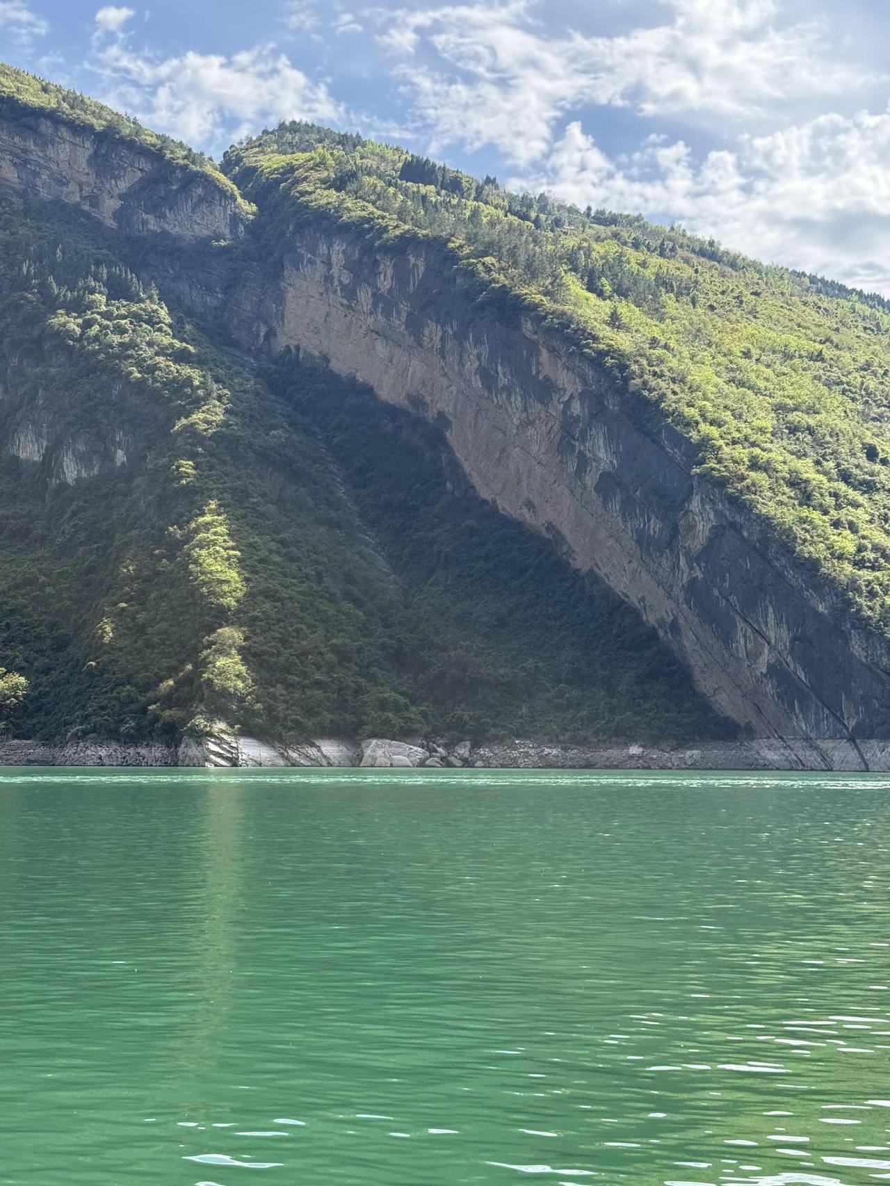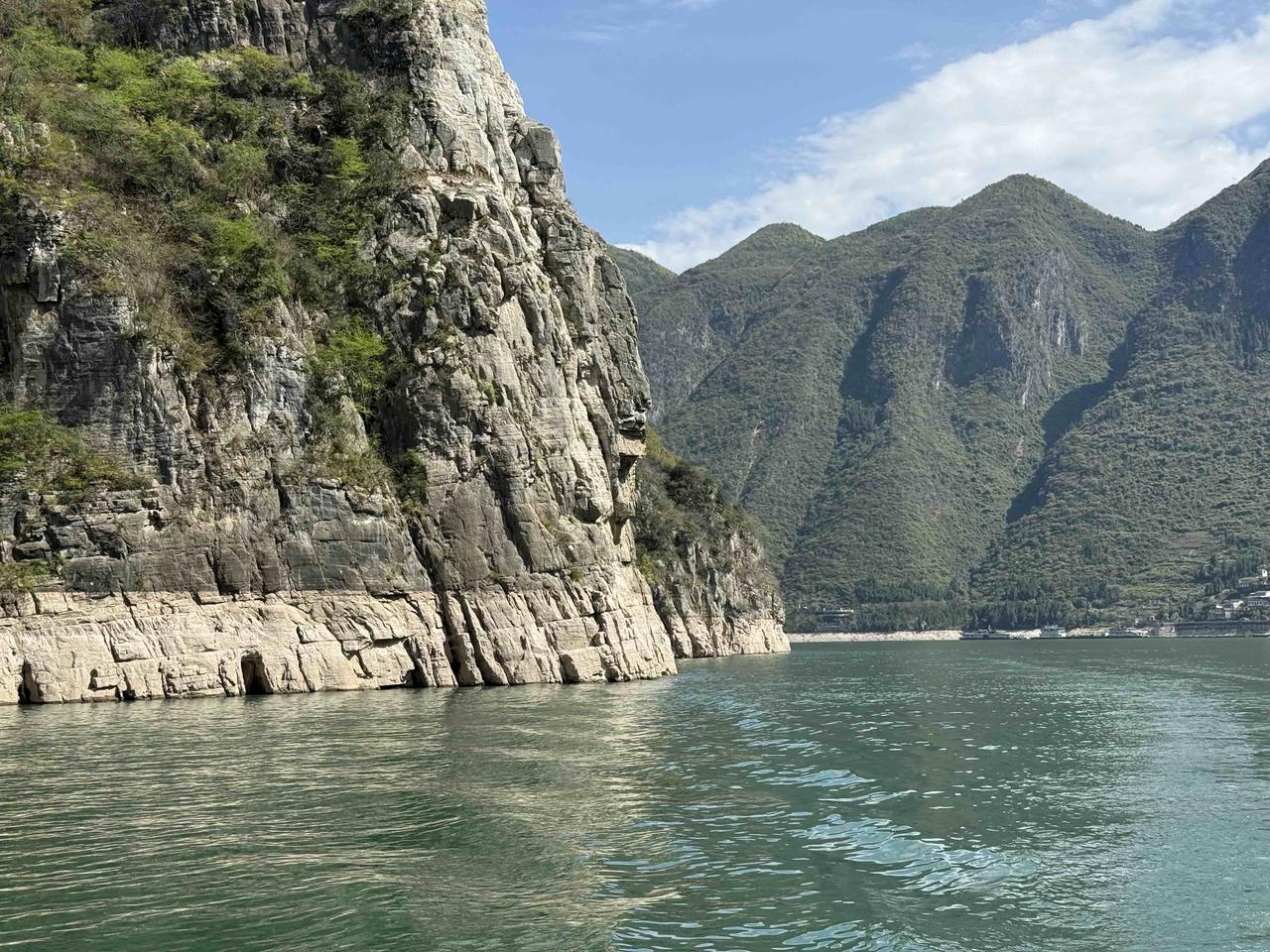 此刻巫峡极具视觉冲击力。山崖如铁,近70度的绝壁沉入长江。山与水进行着无声的较量,力量感紧紧攫住我们,游轮屏息而过,万一失衡,天崩地裂。