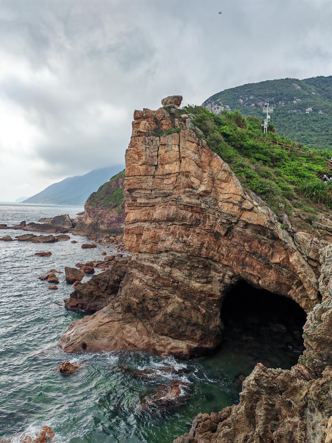 这里面向大海,天高云淡,山势也不高,登上可以看到人鱼洞的小山峰,以为海拔有200米,结果用手机一查,海拔才45米。一路的登山小道和护栏,老人和小朋友也可以不费力地上来,一睹人鱼洞的真容。