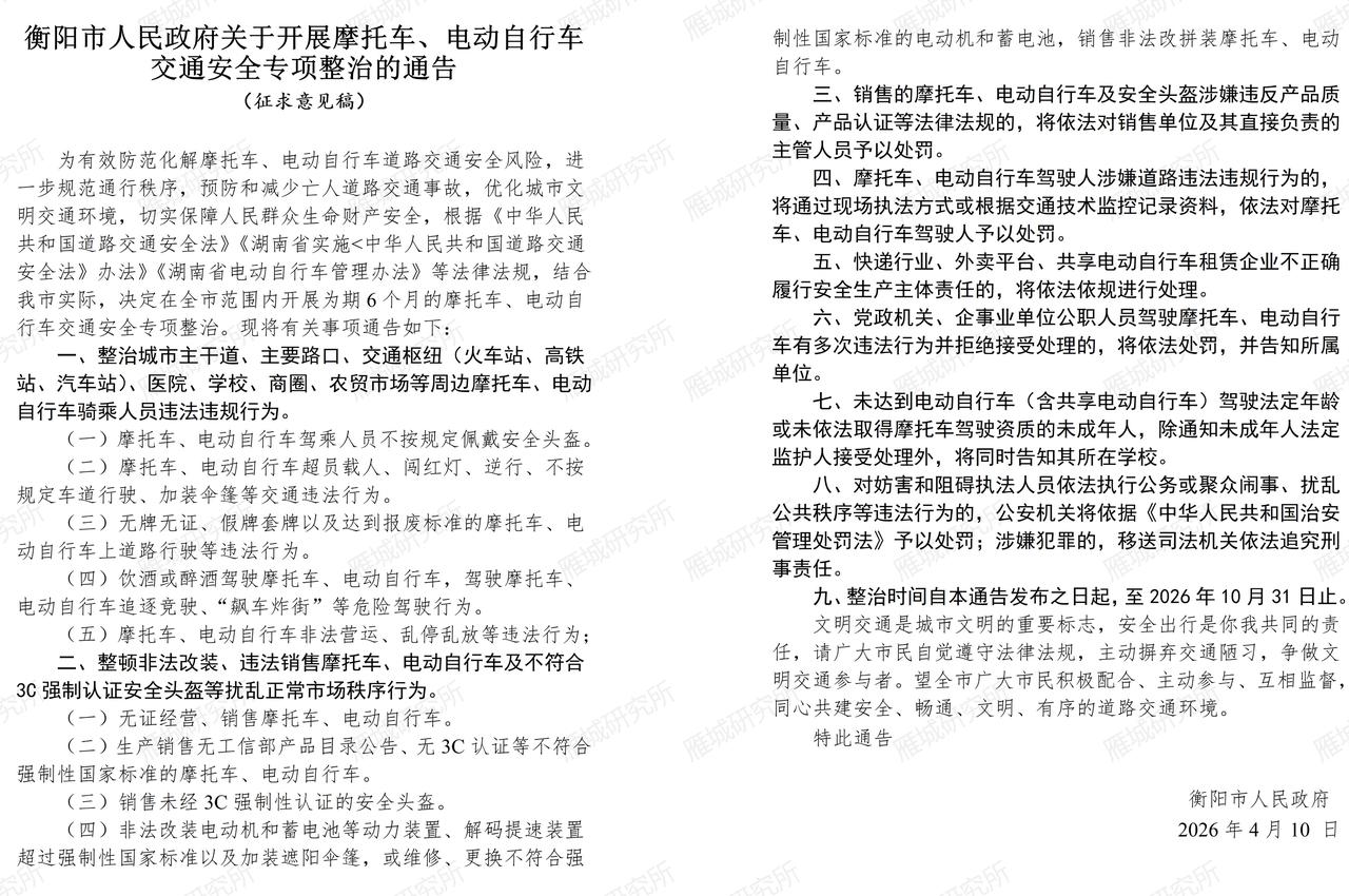 衡阳启动为期6个月摩托车、电动车专项整治!不戴头盔、超员、闯红灯、逆行、加装伞篷、无牌无证、飙车炸街、乱停乱放,一律严查!商家非法改装、售卖无3C认证车辆与头盔,依法处理!