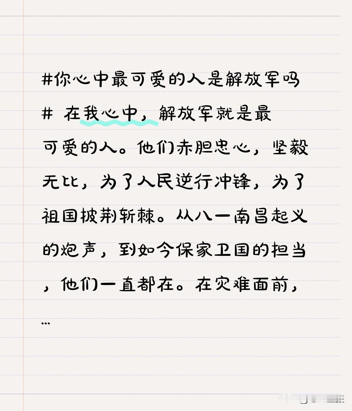 在我心中,解放军就是最可爱的人。他们赤胆忠心,坚毅无比,为了人民逆行冲锋,为了祖国披荆斩棘。从八一南昌起义的炮声,到如今保家卫国的担当,他们一直都在。