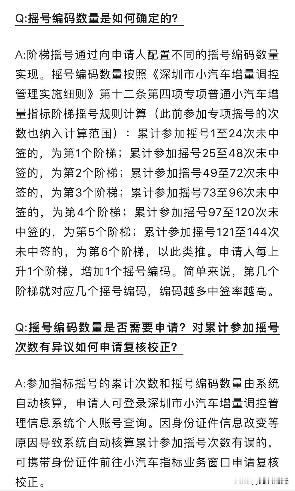 作为一个摇号129期,也就是参加深圳摇号10年未中的老人而言。深圳车牌政策 的变化多少算个利好吧!不过给予各项抽奖、摇号运气而言,对这个阶梯的实质效果还不好说。基本上,没有100%中奖率的活动,都是与我无缘的,平常心对待。