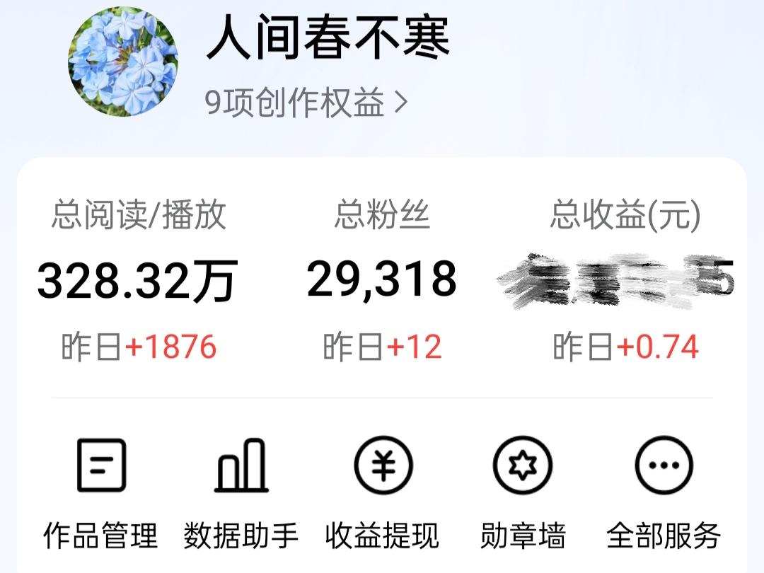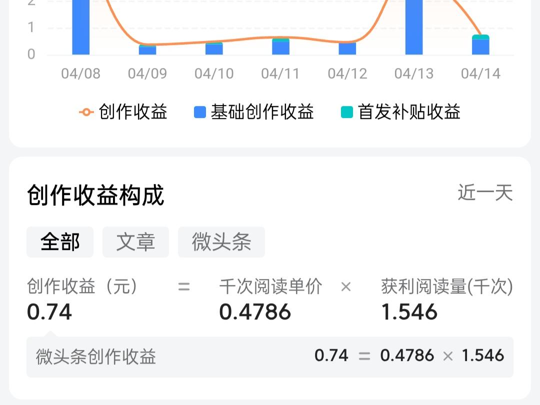 今日头条创作收益0.74元,阅读量1876,新增粉丝12位,千次阅读单价0.4786。