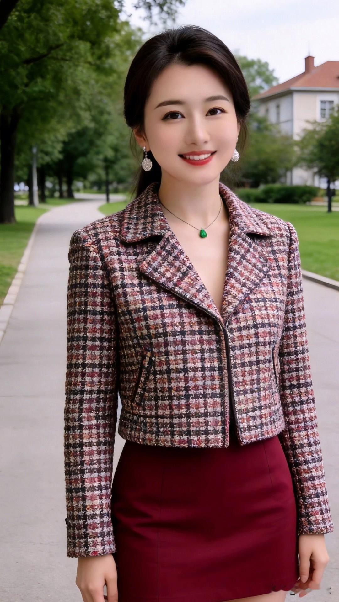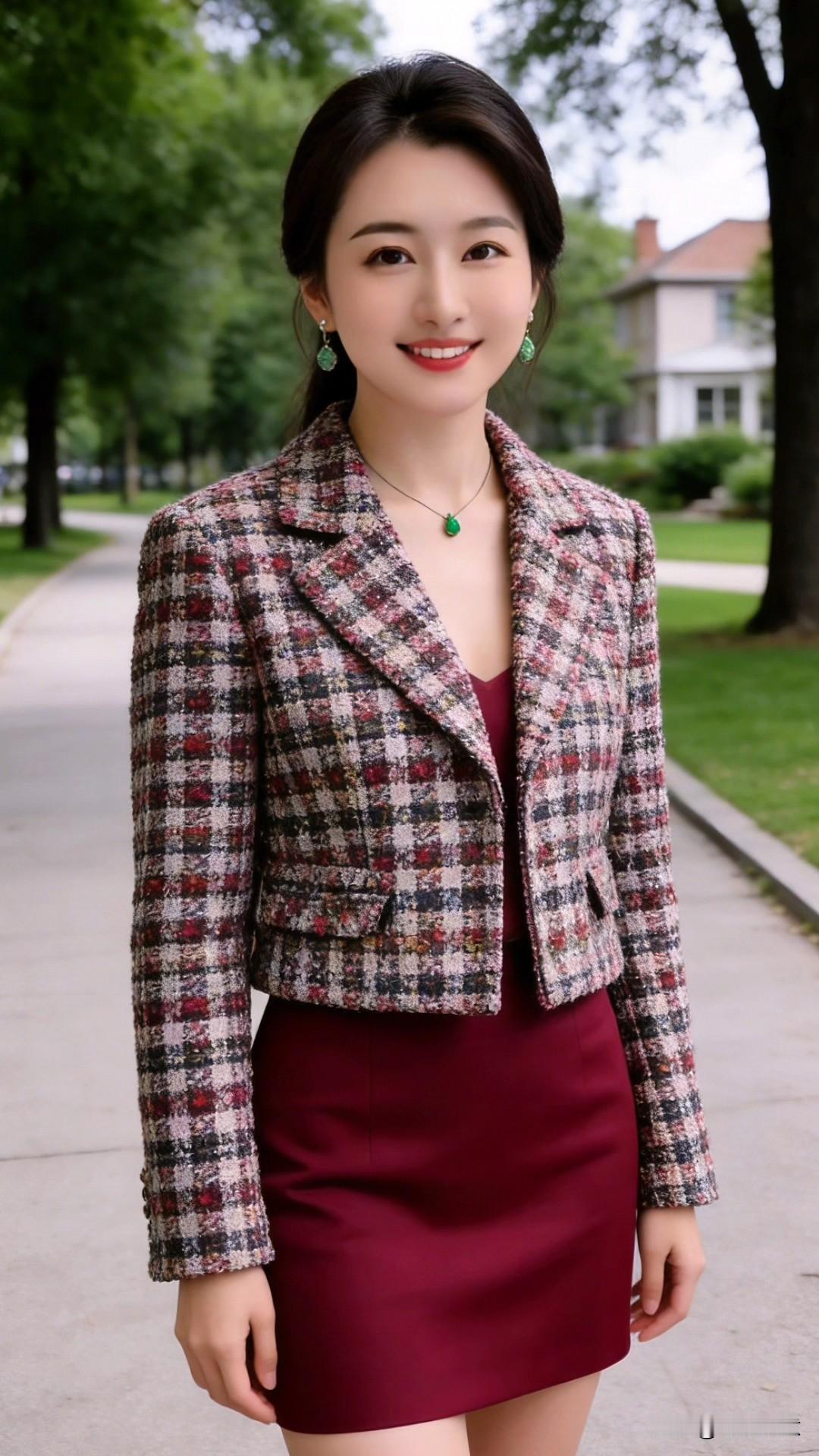 今天给大家推荐一款日常穿的衣服,酒红色吊带裙搭配格纹粗花呢短外套,真的是永不过时的经典组合!