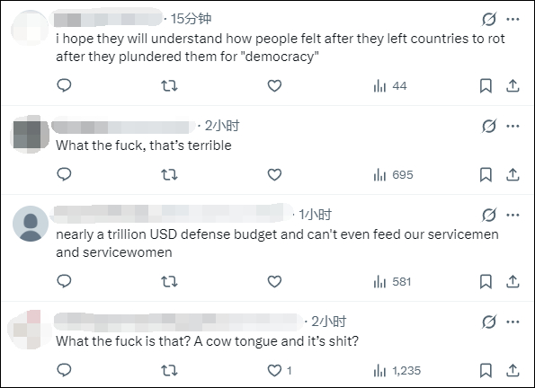 当地时间4月16日,《今日美国报》(USA Today)、《国际财经时报》英国版(IBTimes)报道称,近期部署在伊朗附近的美军官兵家属,已对舰艇上严重的食物配给问题发出警报。从“的黎波里”号两栖攻击舰等美军舰艇上拍摄的照片显示,士兵餐盘几乎空空如也,只有少量碎肉、半对折的玉米饼和加工食品。