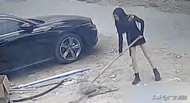- 灭火:两名女生路过,黑衣女生把燃烧纸箱拖离车辆,用铁铲铲沙覆火,快速扑灭后默默离开。